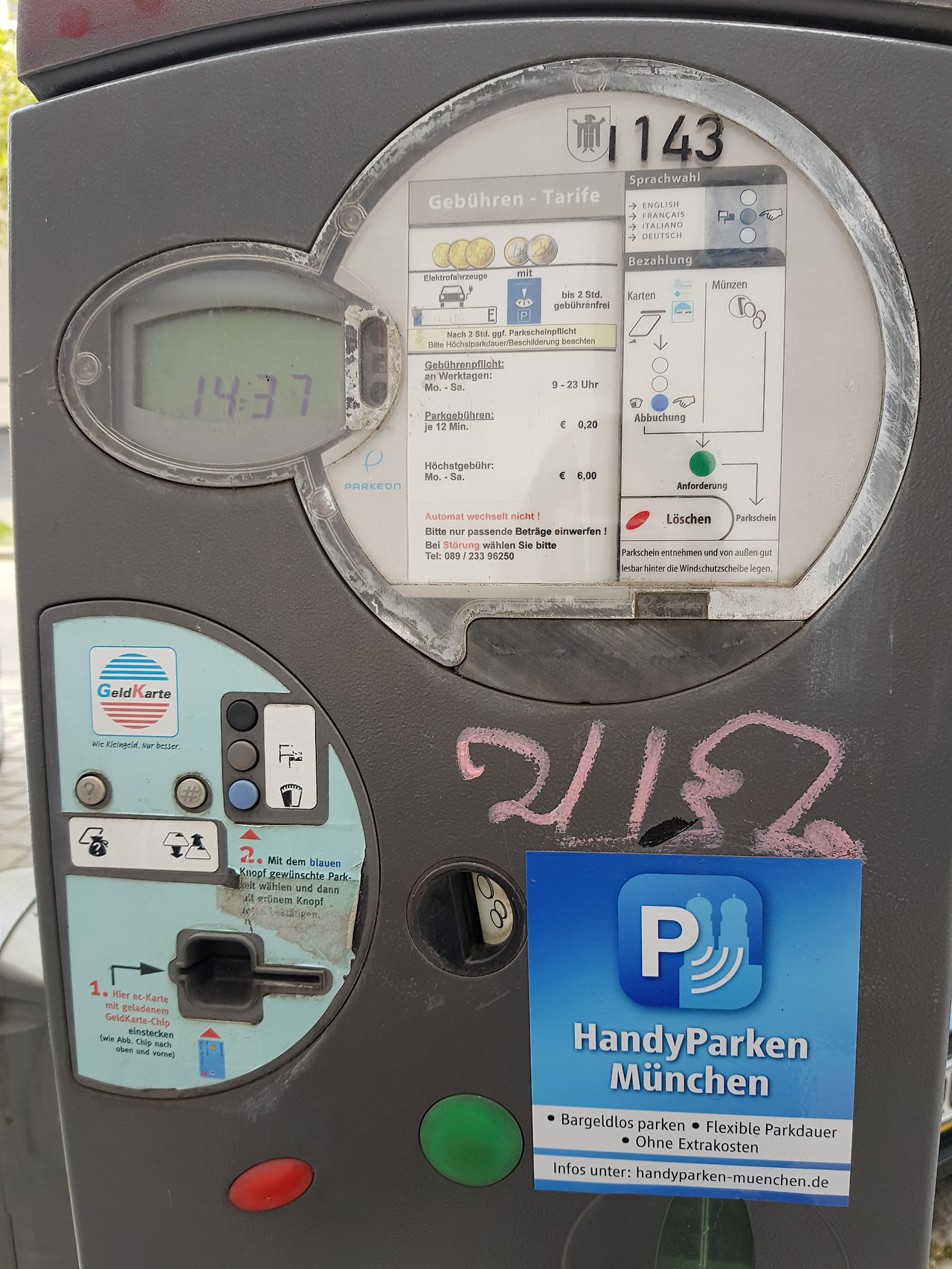 주차 티켓 발매기의 측면과 정면 모습. 어디에나 있다. 우리 동네는 시간당 1유로.