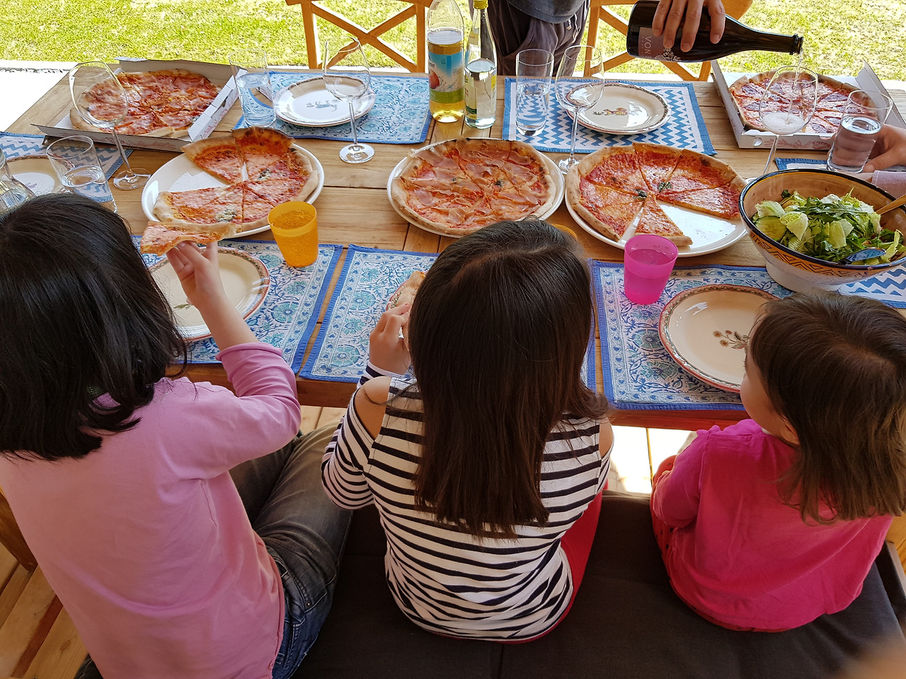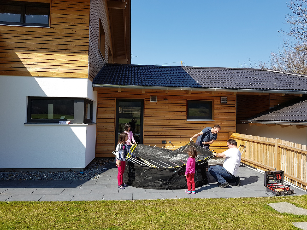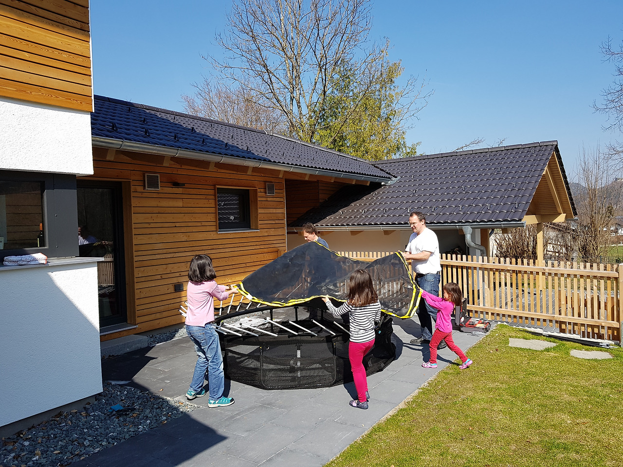 우리가 탄 기차가 바로 잘츠부르크로 가는 기차였다! 너무 늦게 갔더니 만석. 자리가 없어 서서 가다가 중간에 앉았다. 레아마리네가 사는 동네까지는 기차를 한 번 갈아타고 2시간 남짓. 우리가 내린 레아마리네 동네 간이역은 어찌나 정겹던지. 레아마리맘이 아이들과 차로 마중을 나왔다. 레아마리 파파가 오전에 트람폴린을 꺼내서 푸는 데만 1시간 반이 걸렸다고. 그 소리를 듣고 남편이 흐뭇하게 웃었다. 남편이 얼마나 꼼꼼하게 쌌는가를 짐작할 수 있다. 트람폴린은 말짱하고 깨끗했다. 뜨거운 햇살 아래 점심으로 피자를 먹고 두 파파의 팀워크로 트람폴린 설치가 시작되었다. 힘과 땀과 시간이 많이 드는 작업에 아이들도 힘을 실었다.