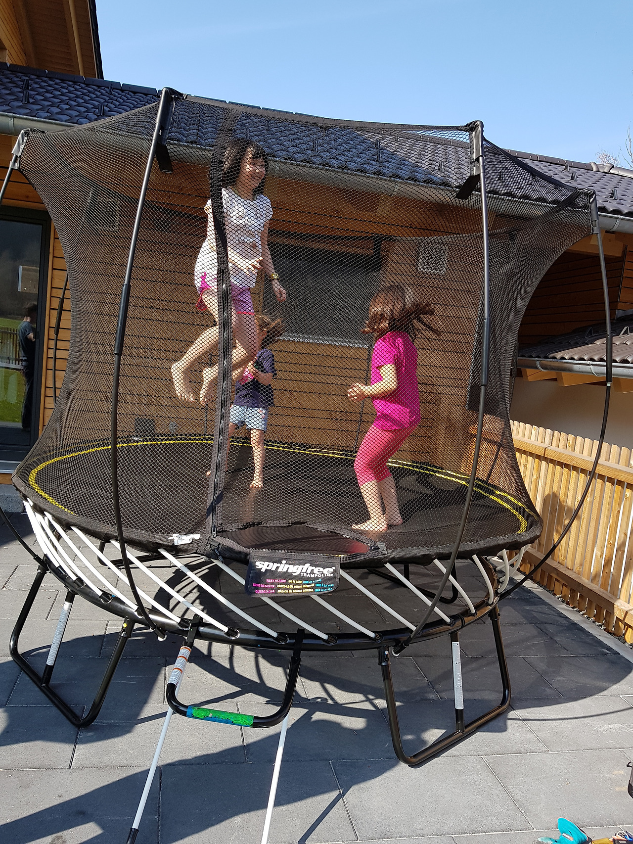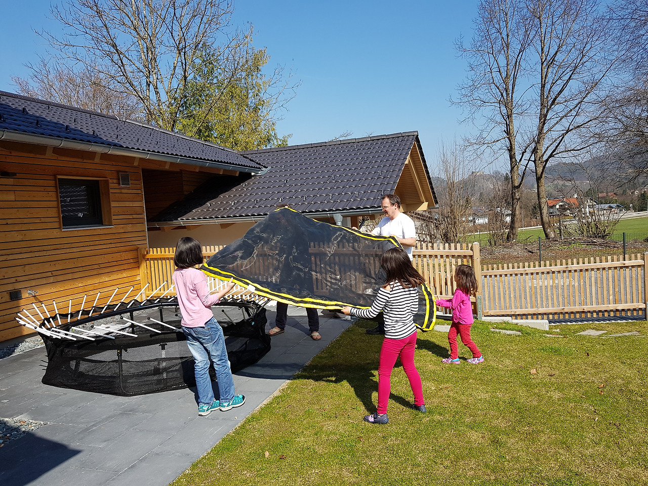 드디어 완성! 아이들은 오후 내내 몇 시간이나 트람폴린 위에서 뛰고 뒹굴었다. 레아마리 파파의 사촌네 아이까지 놀러 와서 여자 아이 네 명이 신나게 놀았다. 트람폴린 하나가 웬만한 베이비시터보다 낫다는 레아마리맘의 말에 웃음을 터뜨리며. 정원의 야외 테이블에는 이른 봄의 오후 햇살이 깊숙이 들어왔고 산들바람은 부드러웠다. 정원에 앉아 바라다 보이는 파릇파릇 물들어가는 들판과 멀리 산들의 자태가 아름다웠다. 산은 푸르고 하늘은 높은 곳. 이런 곳이 무릉도원 아닐까. 물론 시골에서 나고 자란 나는 자연에 익숙하면서도 한편으로 도시 생활을 더 좋아하지만.