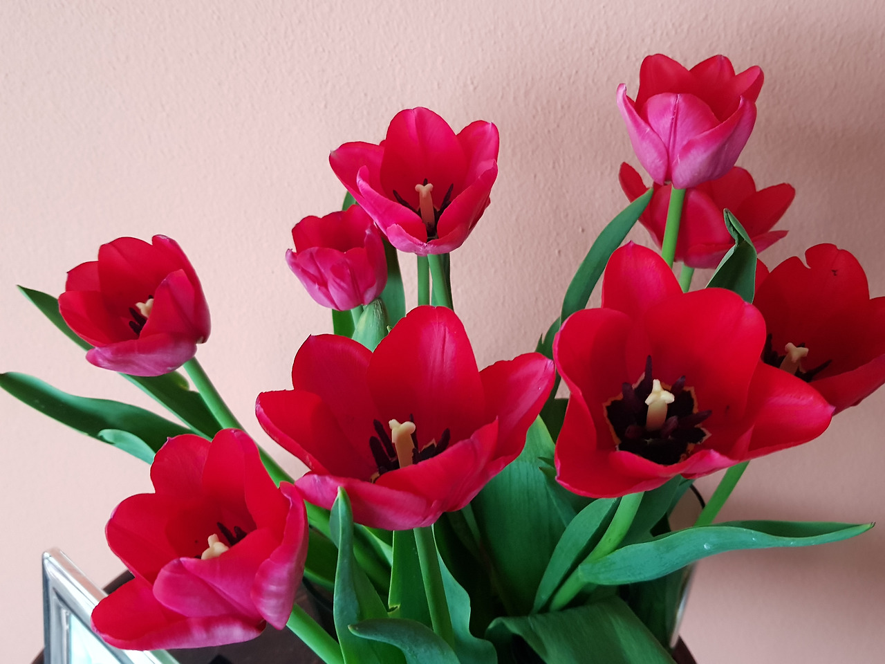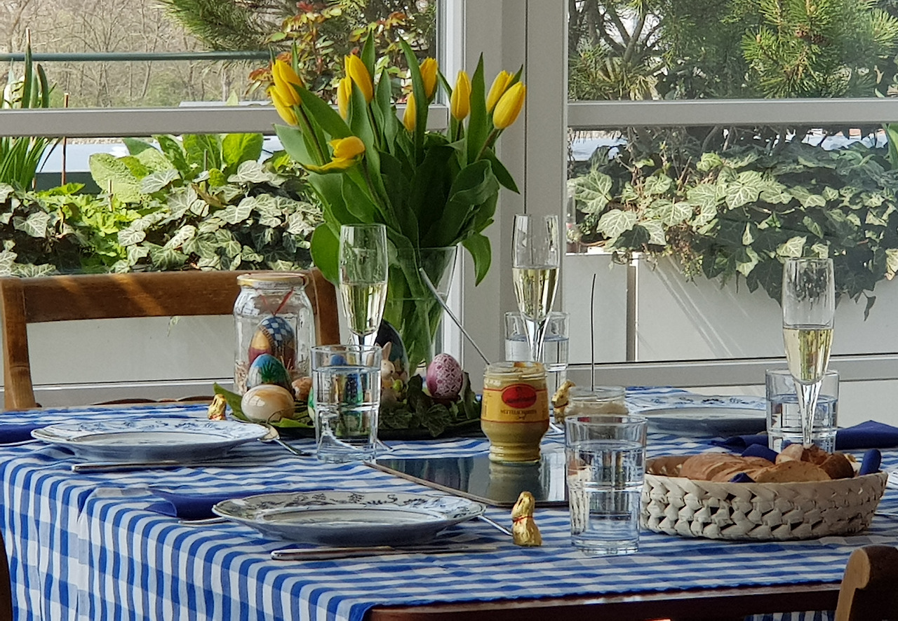 어머니의 꽃장식 빨간 튤립과 우리가 사 간 노란 튤립, 부활절 계란 장식(위) 점심 식탁과 어머니가 사시는 친환경 아파트 단지(아래).
