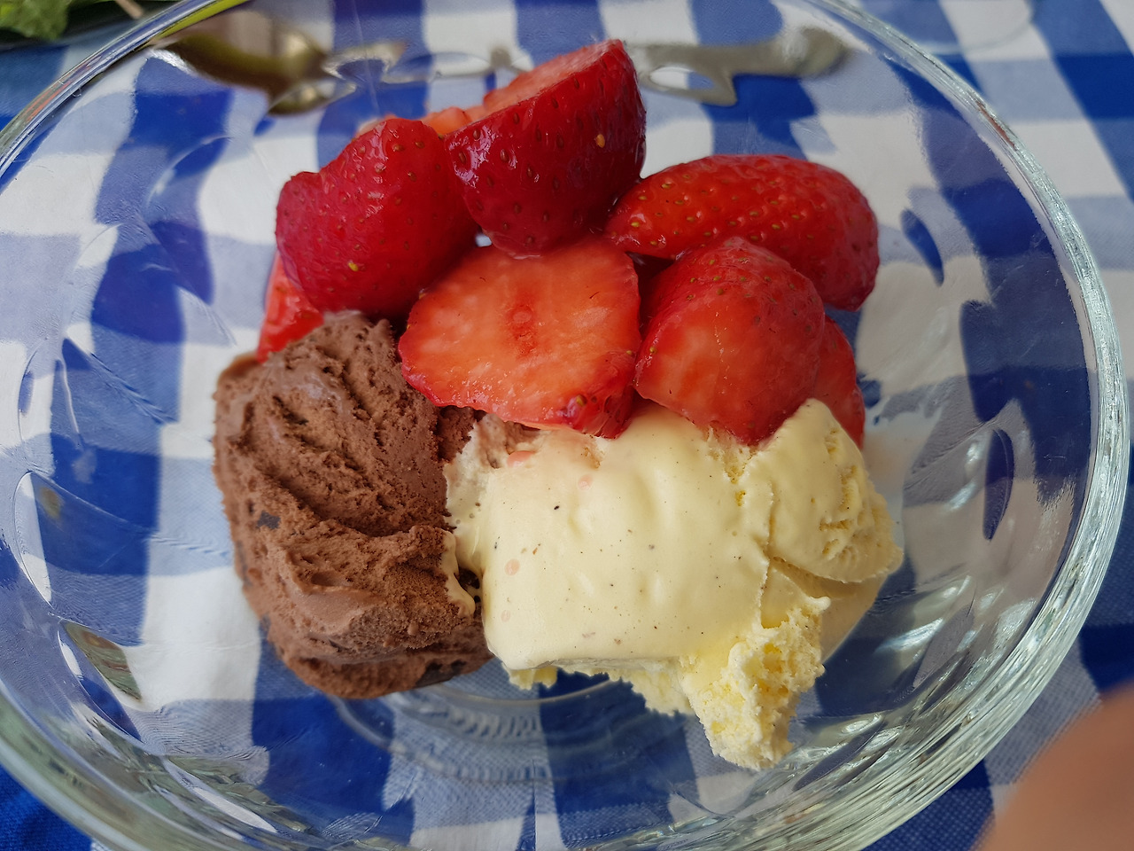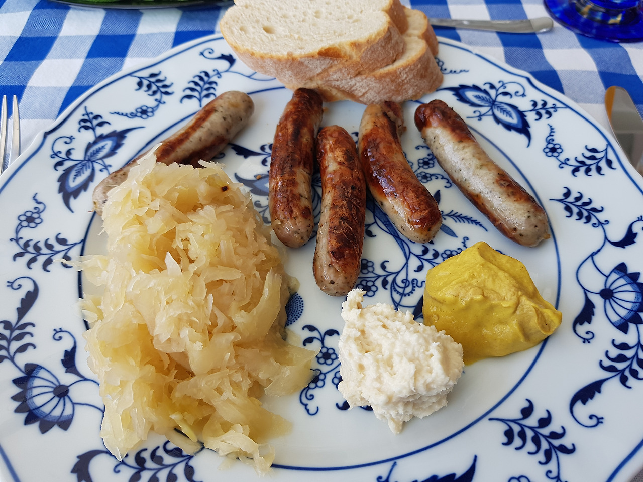 우리가 가면 새어머니가 준비하시는 독일다운 점심식사. 샴페인과 소시지, 자우어 크라우트, 소스. 후식은 아이스크림.