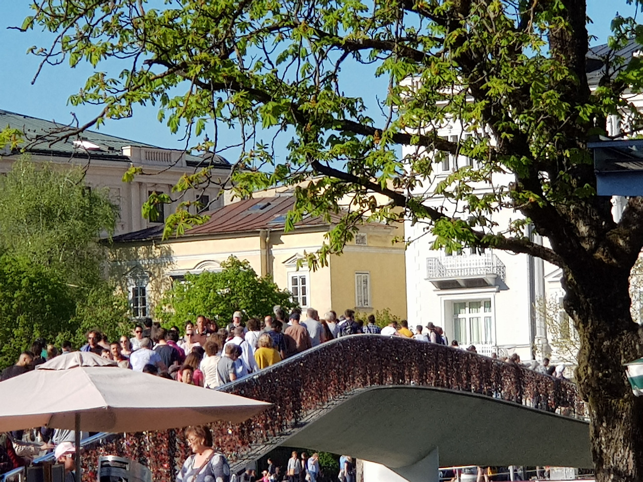 그날은 날씨가 덥고 햇볕이 강했어요. 더 피로했던 건 어딜 가나 넘치던 관광객들과 모차르트의 집에 빼곡하던 관람객들이었고요. 두 집의 동선이 가까운 게 그나마 다행이었어요. 일명 '사랑의 자물쇠 다리'로 불리는 마카르트 다리만 지나면 갈 수 있거든요. 입장료(어른 11/어린이 3.50유로)는 비쌌어요. 두 곳 방문시 콤비 티켓(어른 18/어린이 5유로)이 있다는 건 생가에 가서 알았죠. 매표소에 말했더니 콤비 가격으로 할인을 해주네요. 합리성의 나라 맞고요. 독일어를 사용하는 것도 마음 편했답니다.
