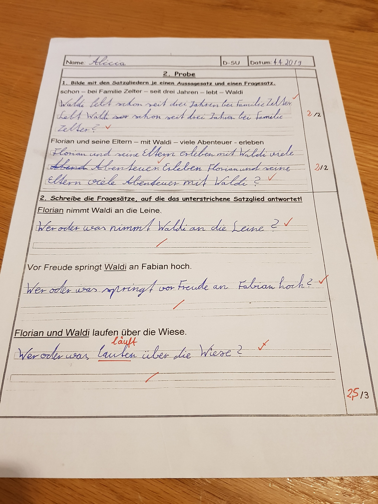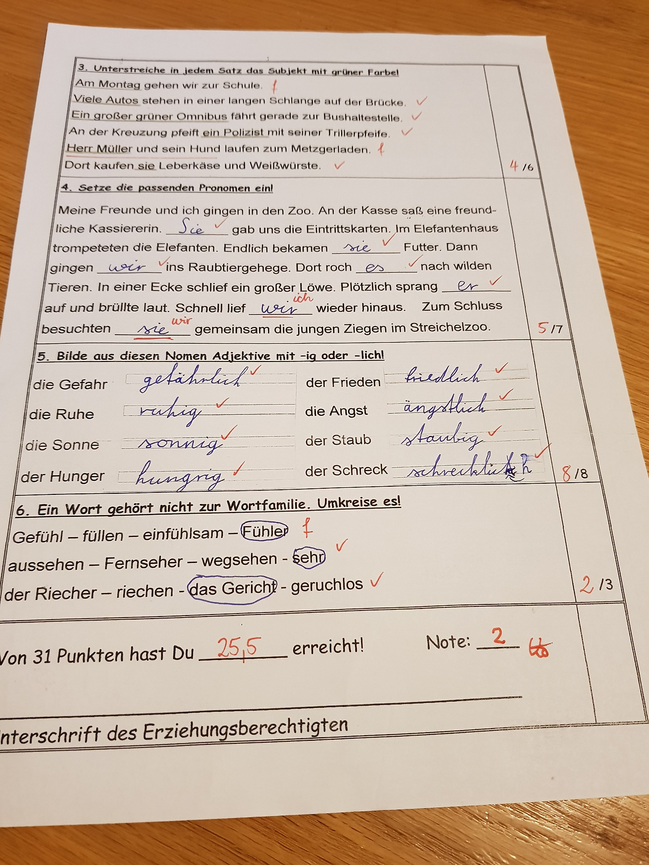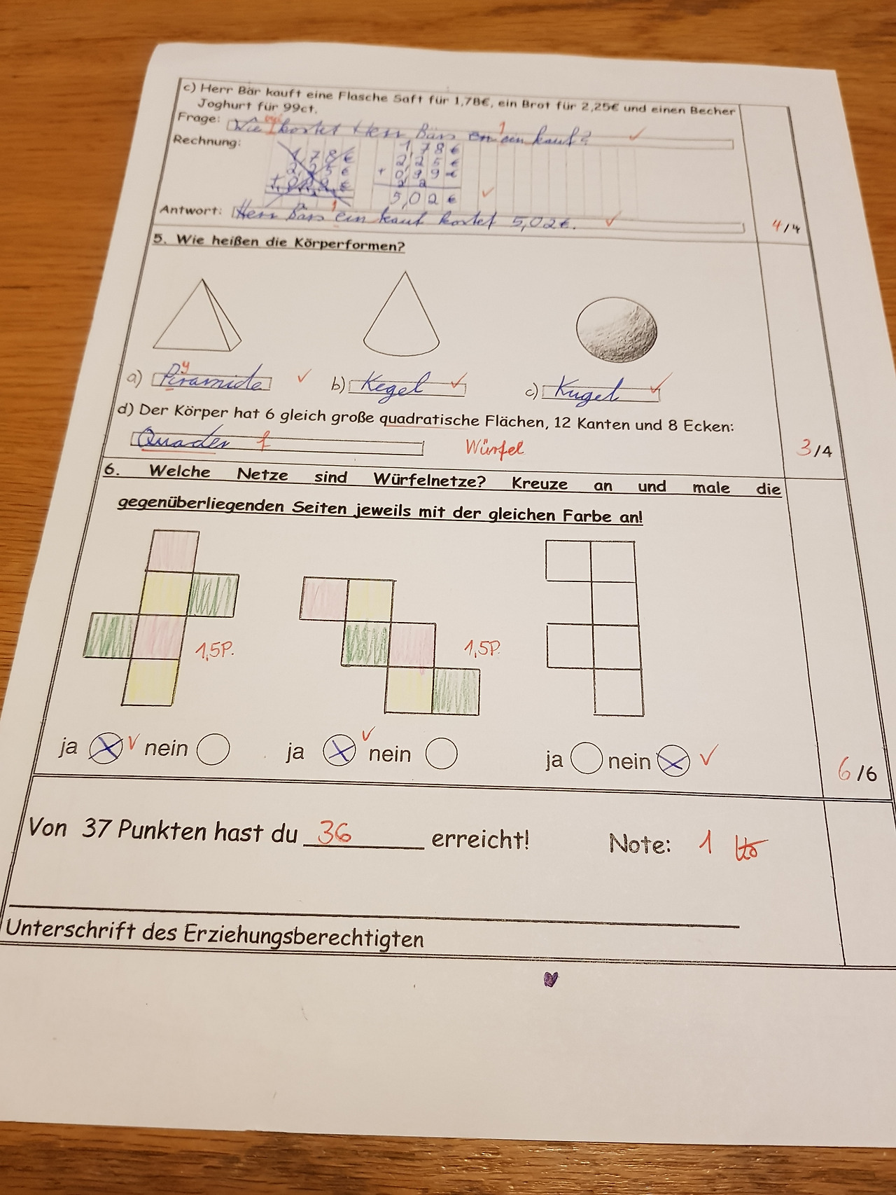 이유는 방학 전에 친 수학과 독일어 시험 답안지를 받는다는 거였다. 아이는 수학을 좋아하고 독일어를 좋아하지 않는다. 당연히 수학 점수는 좋고 독일어는 별로다. 그런데 방학 전에 예고도 없이 친 독일어 시험에서 답을 다 썼단다. 다 썼다고 다 맞다는 보장은 어디 있나? 아이의 고민이 바로 그거였다. (물론 엄마와는 정반대로 행복한 고민이었다!) 아이가 흥분을 감추지 못하는 이유. 다 맞으면 어쩌지? 다 맞는 거 아니야??그러다 독일어 1(최고 점수) 받는 거 아닐까???