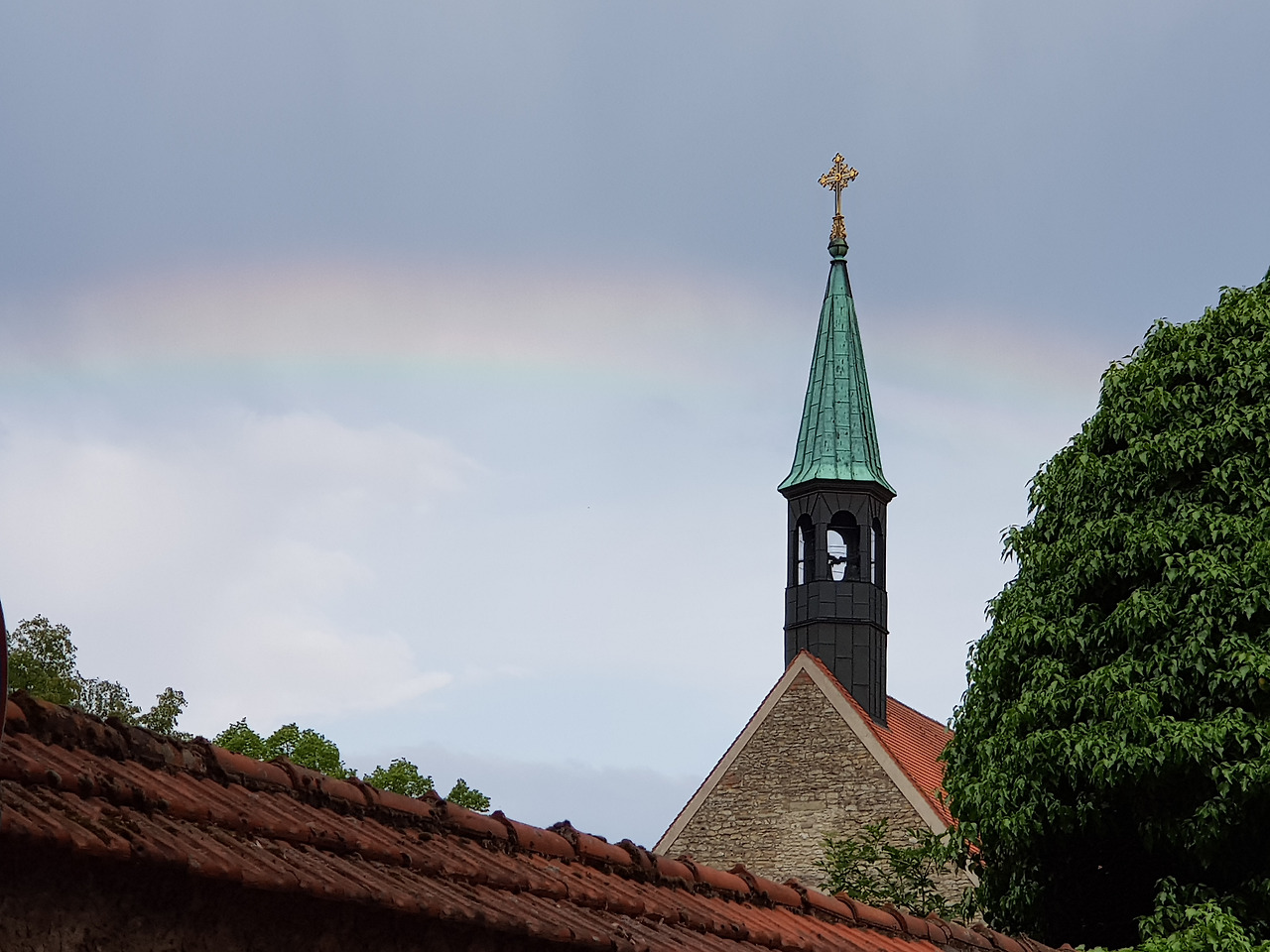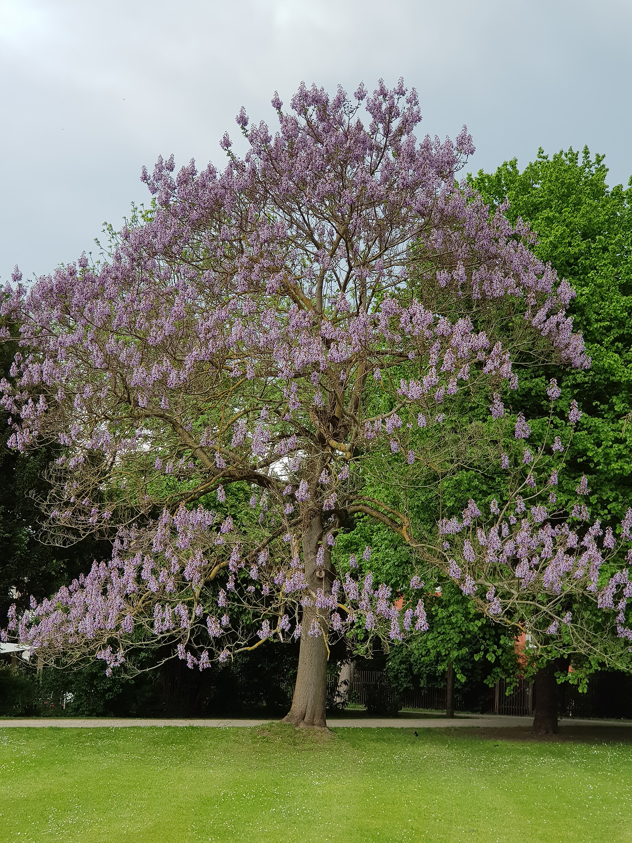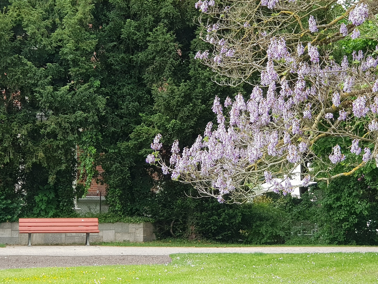 담장에 덩굴을 뻗기 시작하는 잎과 줄기도 예뻤고, 창가에 내놓은 화분들도 예뻤다. 골목들, 교회의 첨탑, 먹구름, 그 사이를 가로지르던 무지개. 새어머니와 함께 있을 때 자주 무지개를 보는 것도 신기했다. 30분을 걸어온 후 작은 공원에서 만난 나무는 압권이었다.새어머니께 여쭈니 야카란다 혹은 자카란다 Jacaranda라고 불리는 보랏빛 꽃이 피는 나무였다. 원산지는 남아메리카나 중앙아메리카의 열대 및 아열대 지역과 멕시코란다.