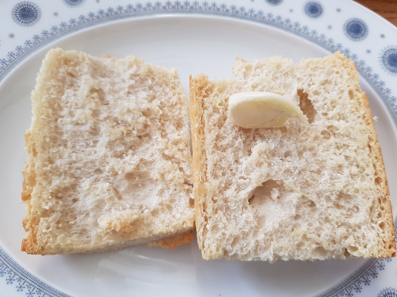 정희옥 작가가 다른 질문도 했다. 브루스케타 만들기에서 바게트 빵에 마늘을 문지른다고 썼는데 어떻게 문지르나. 그래서 오늘 아침에는 다시 해봤다. 덕분에 아침부터 맛있는 브루스케타와 커피 한 잔에 햇살을 휘핑크림처럼 듬뿍 넣고 마셨더니속이 따끈하고 든든했다. 오븐이나 뜨겁게 달군 팬에 적당한 크기로 자른 바게트 빵을 겉이 바삭하게 굽고 마늘 한쪽을 빵의 거친 표면에 쓱쓱 문지르면 된다. 준비한 토핑을 얹고 한 입 베어 물면 마늘향이 향긋!