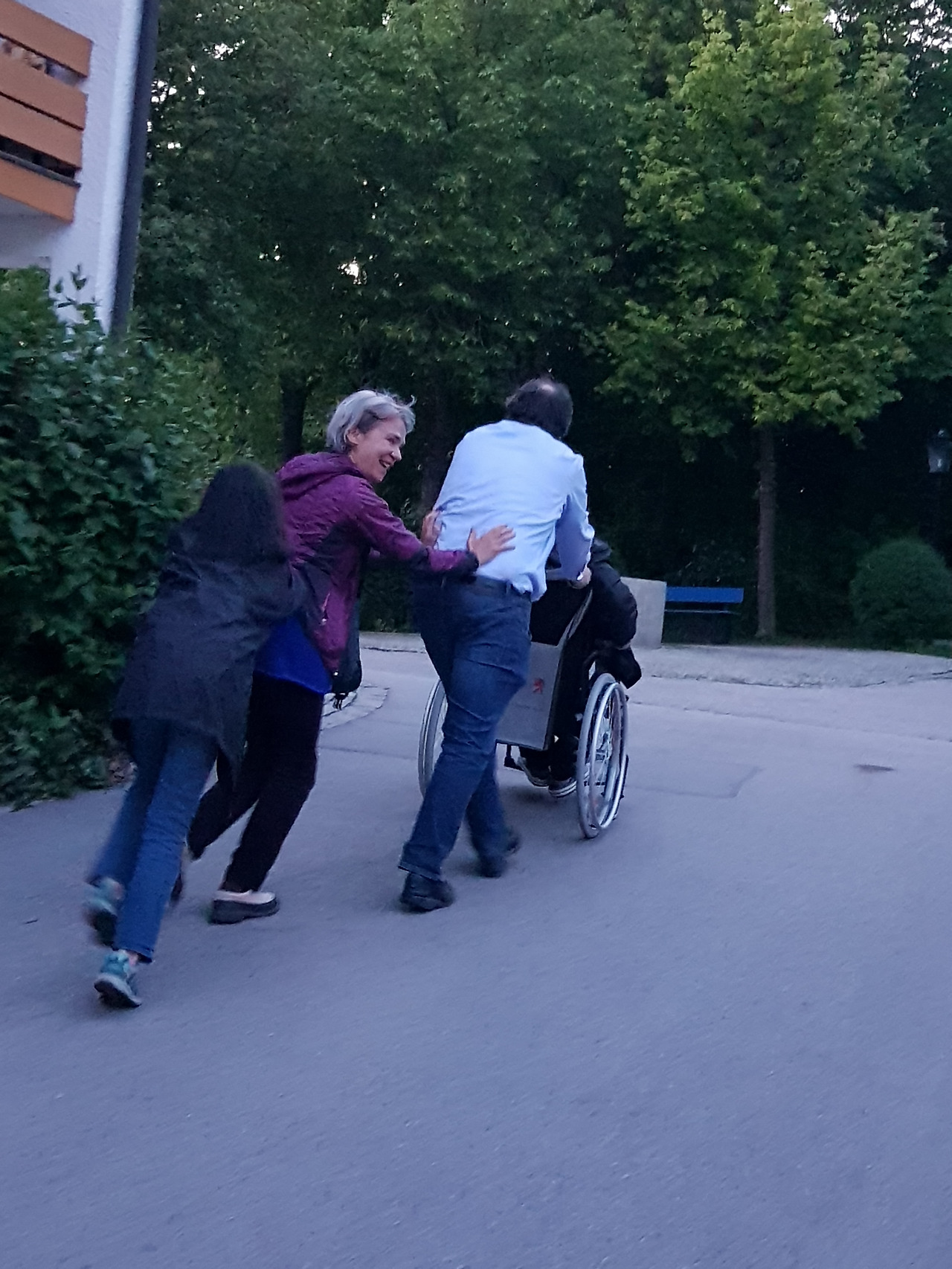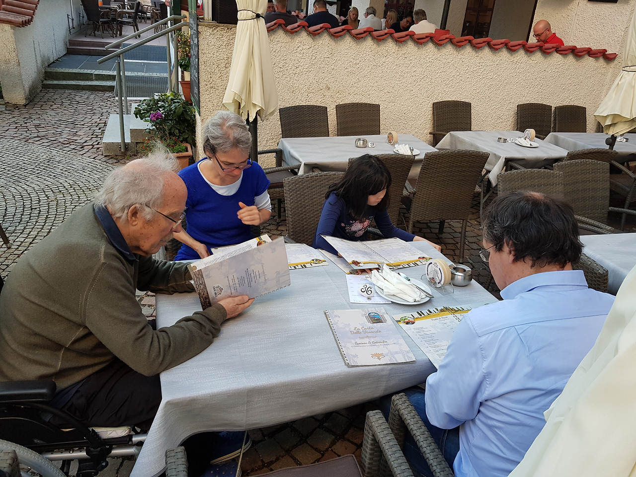 그날 늦은 오후의 오솔길 산책을 마치고 룸으로 돌아온 건 저녁 7시. 시아버지의 윗옷을 챙겨서 광장 야외 이태리 레스토랑에서 저녁을 먹었다. 시아버지는 우리가 도착하기 직전에 저녁을 드셨다. 우리는 와인 한 잔씩을 마셨고, 시아버지는 와인 반 물 반인 와인 숄레를 주문하셨다. 온화한 저녁이었다. 춥지도 않았다. 해가 늦게까지 광장 지붕에 머물러 주었다. 기분이 좋아지신 시아버지가 자신의 와인 숄레 잔에 바바라와 나의 화이트 와인을 슬쩍 부으시는 것도 눈감아 드렸다. 아리아도 몇 곡 흘러나온 것으로 기억한다. 밤 9시 반에 우리는 병실을 떠나 뮌헨으로 돌아왔다.