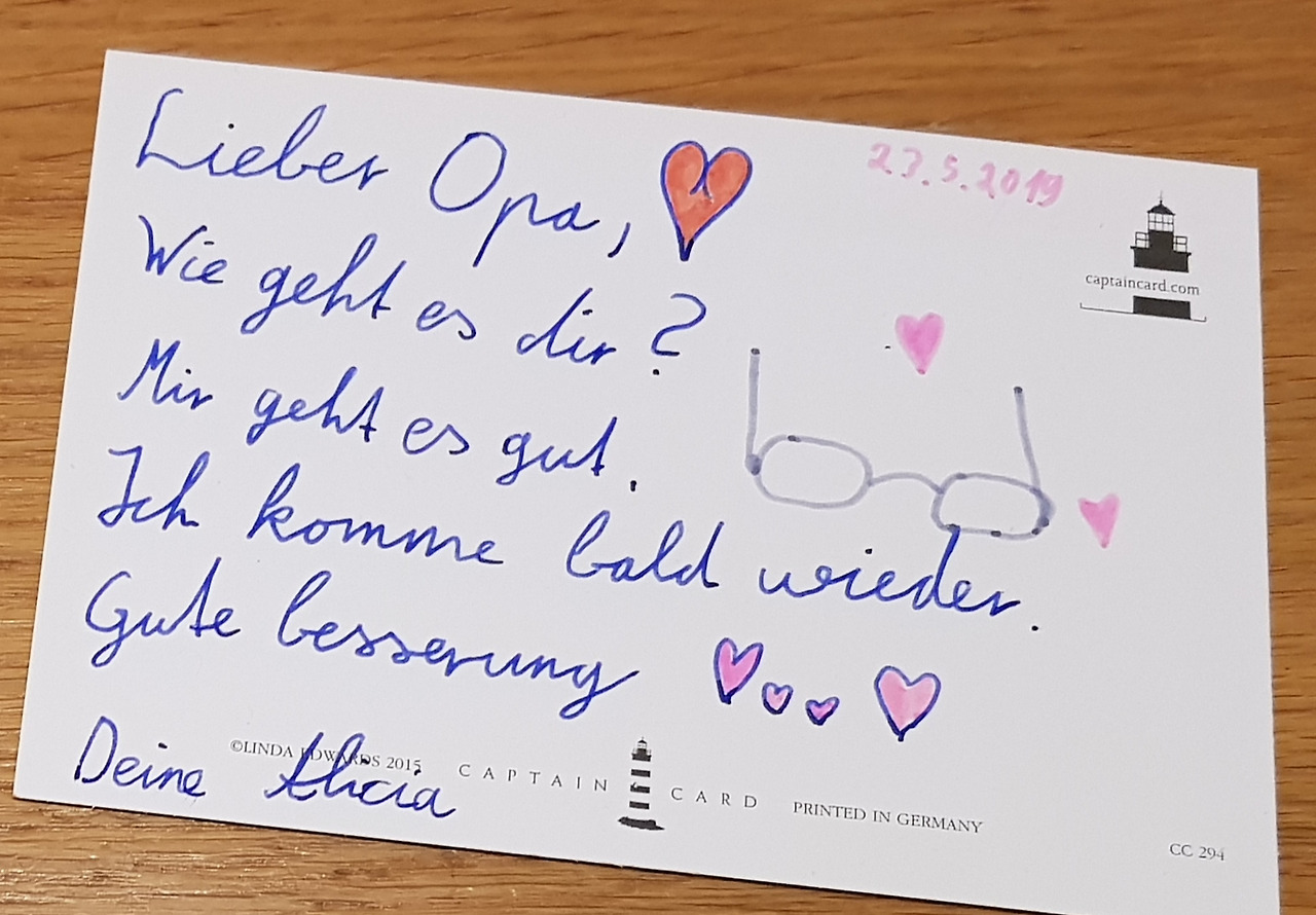 '할아버지, 어떻게 지내세요? 저는 잘 지내요. 제가 금방 다시 올게요. 몸조리 잘하세요! 알리시아 올림.'