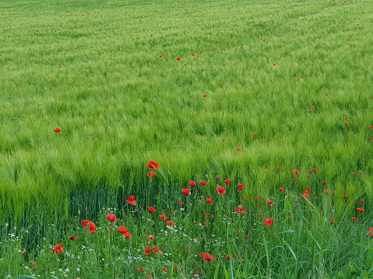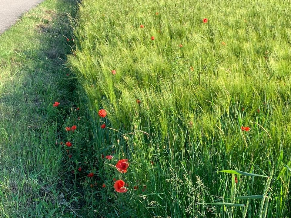 독일의 봄의 절정은 보리밭처럼 온통 초록인 홉이 익어가는 들판에 핀 새빨간 양귀비꽃 같아요. 들판에 핀 꽃은 함부로 꺾으면 안 된다는 것도 배웠어요. 한 줌 꺽어왔더니 다음날 금세 시들어 버렸거든요.