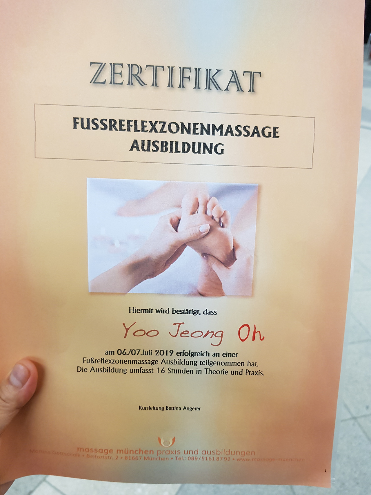 수순은 자기소개부터. 침상이 네 개인 마사지 룸에서는 두 명이 한 조가 되어 실습을 해야 했다. 남녀 불문 최대한 모든 참가자들과 상대를 바꿔 실습을 해 보는 게 목표였다. '난 한국인. 이름은 유.. 아니야, 그냥 마리라고 불러!' 그러나 자격증에는 반드시 한국 이름을 넣어 달라고 부탁했다. 왜 마리냐고? 이십 대 때 성당을 다녔는데 세례명이 마리안나여서 나를 마리 Mari라고 불렀다. 올해 독일어로 카뮈의 <이방인>을 읽다가 주인공의 여자 친구 마리 Marie에게 마음을 내준 것도 그렇고. 선생님인 베티나가 실습 노트에 Marie라고 적는순간 나는 마리가 되었다.
