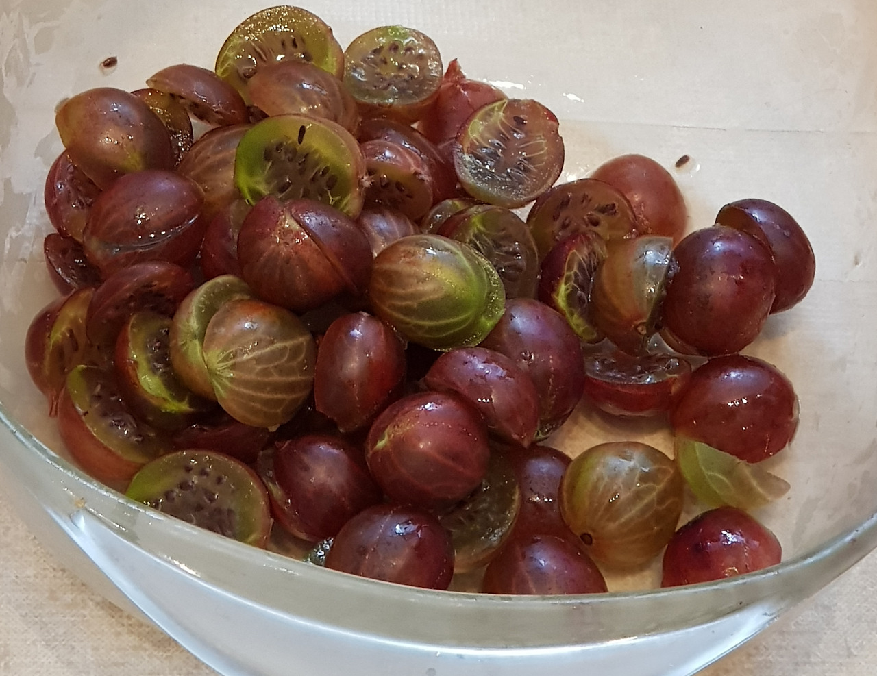 올해도 살구를 빼놓을 수 없다. 저 연하고 귀하고 부드럽고 우아한 살구색이라니! 보는 것만으로도 기쁨이 밀려온다. 맛은 또 어떤가! 지나치게 달지도 않으면서 입 안에서 살살 녹는 맛. 보기에 좋은 떡이 먹기에도 역시 좋다. 살구는 1킬로, 총 여섯 병을 수확했다. 다음이 문제인데 두 가지 베리류가 있었다. 작년에도 같은 걸 만드셨는데 독일어로 요하네스 베어 Johannisbeer와 슈타헬 베어 Stachelbeer다. 한국에서는 본 적이 없는 과일이라 한국식 이름을 모르겠다. 두 종류의 베리를섞어서 2킬로에 총 12병이 나왔다.설탕도 각기 다른 걸 쓰셨다.레몬즙도 짜넣으시고 도수가 40도인 슈납스도 별도로 한 잔씩 투하!이런 게 진정한 할머니 레시피의 비결이겠다.