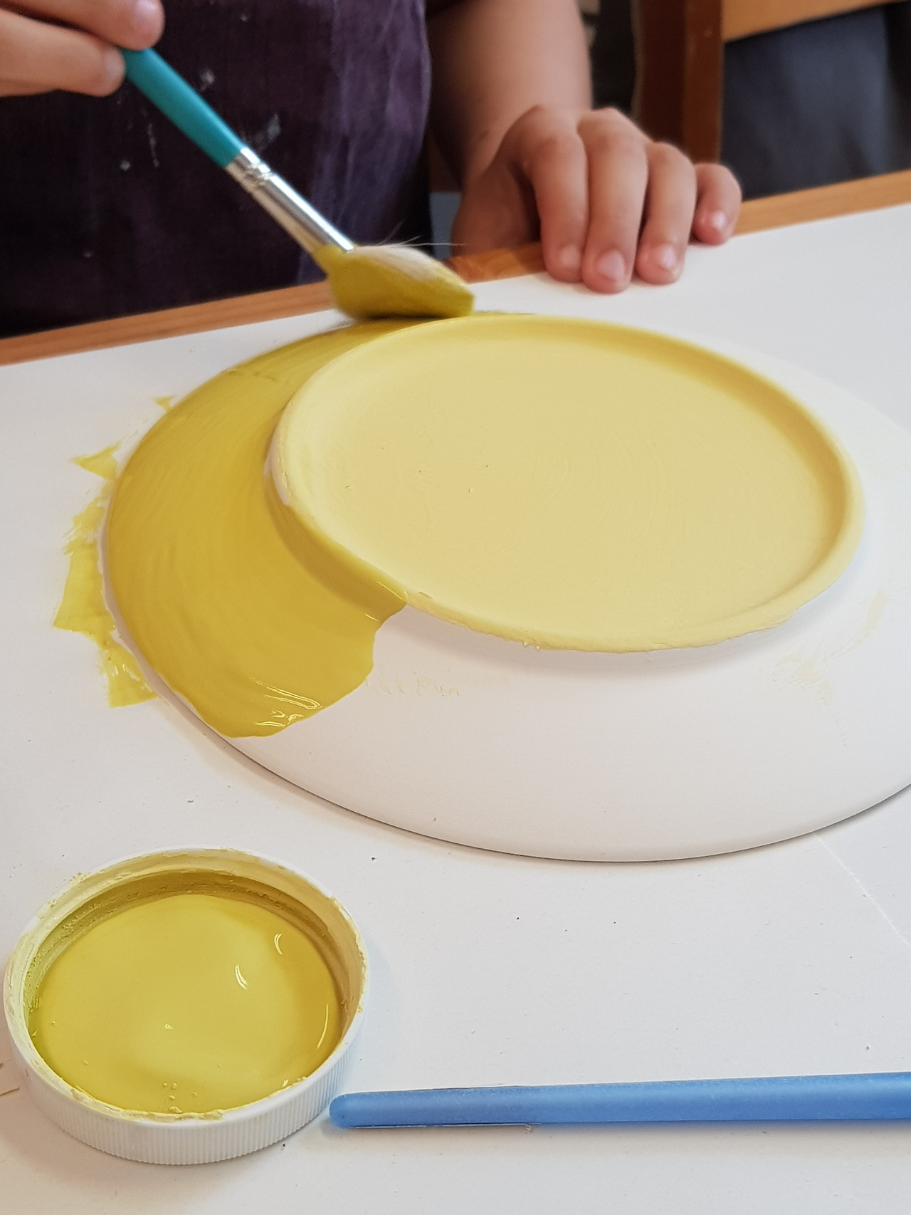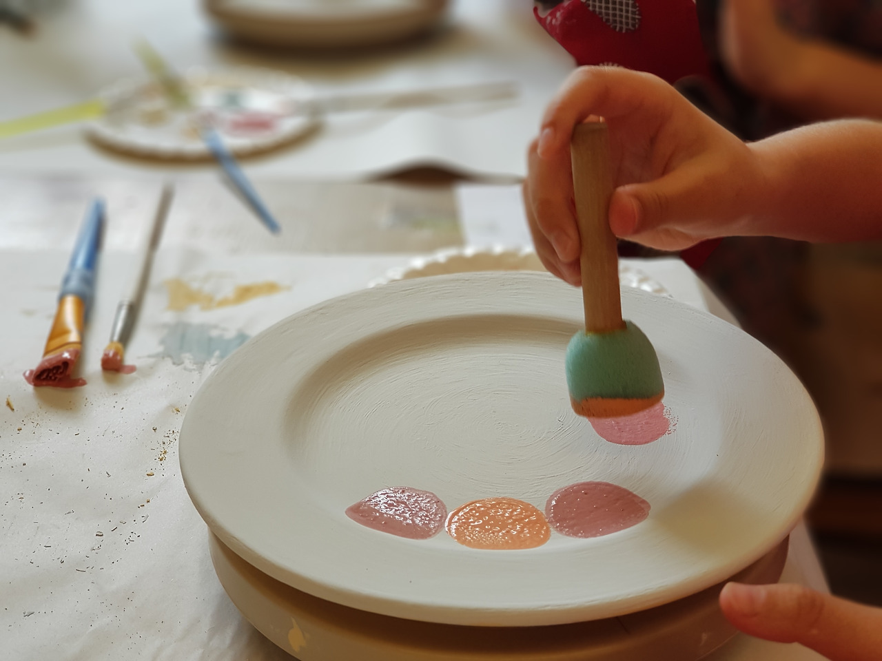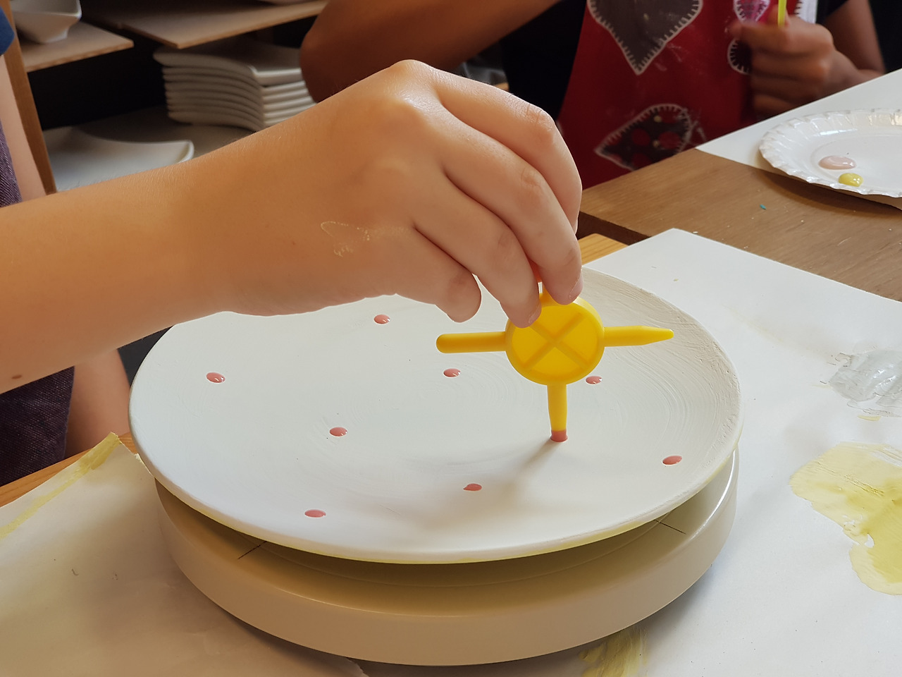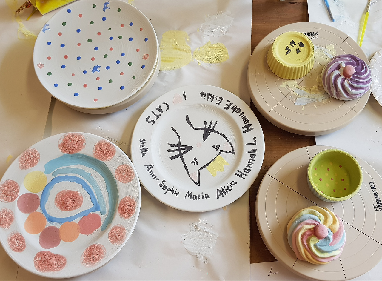 공방에서 다섯 아이들을 지켜보며 놀란 건 아이들의 자율성과 창의성이었다. 내가 할 일은 없었다. 만 9세 아이들에겐 반드시 보호자가 1명 있어야 하기에 자리만 지켰다. 아이들은 공방의 담당자에게 붓과 물감 사용 방법에 대한 설명을 들었고, 알아서 원하는 접시 등을 골라왔고, 자기가 좋아하는 색깔과 디자인을 선택했다. 누구도 고민하거나 물어보거나 망설이지 않았다. 가장 놀란 건 카타리나. 접시 안쪽은 스펀지로 찍고, 접시 바깥쪽은 비눗방울처럼 물감 방울을 떨어뜨려 완성하더라는 것.