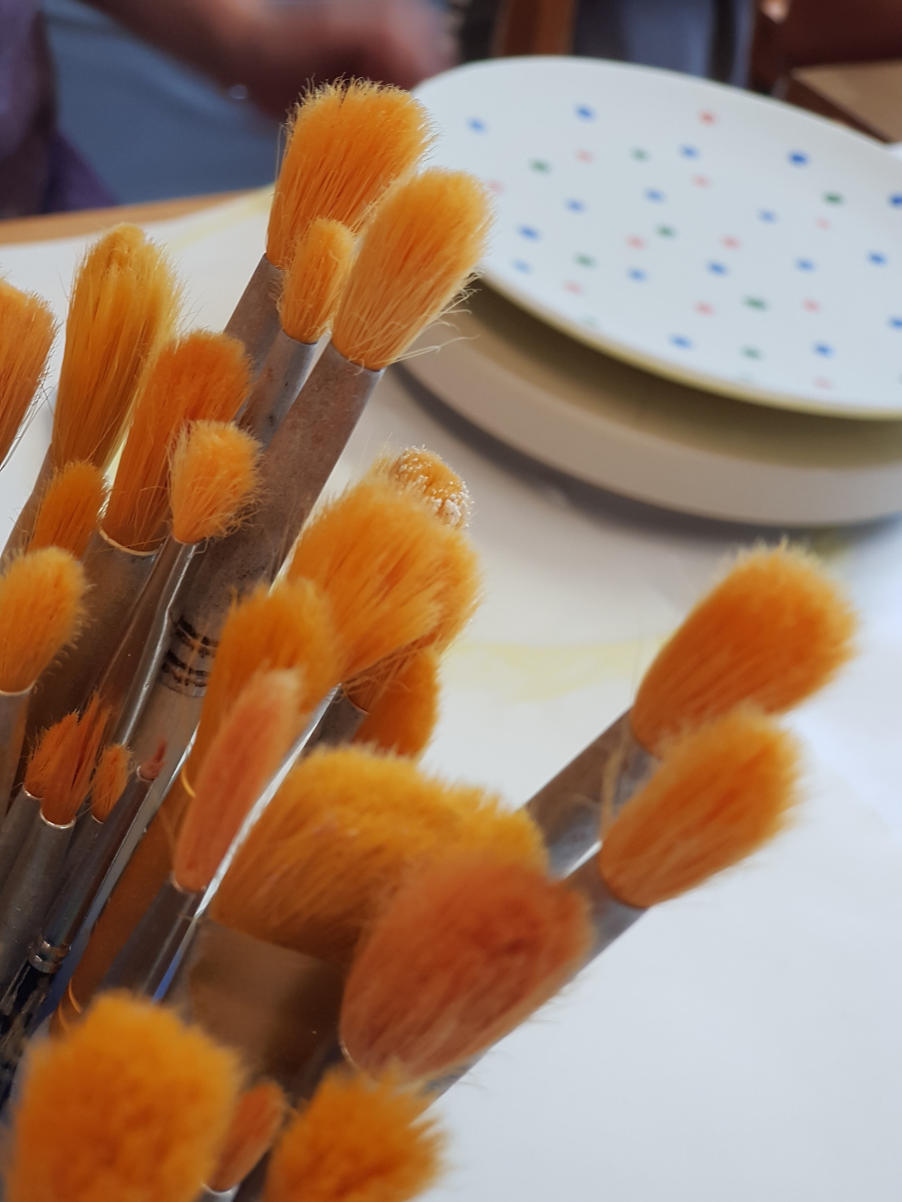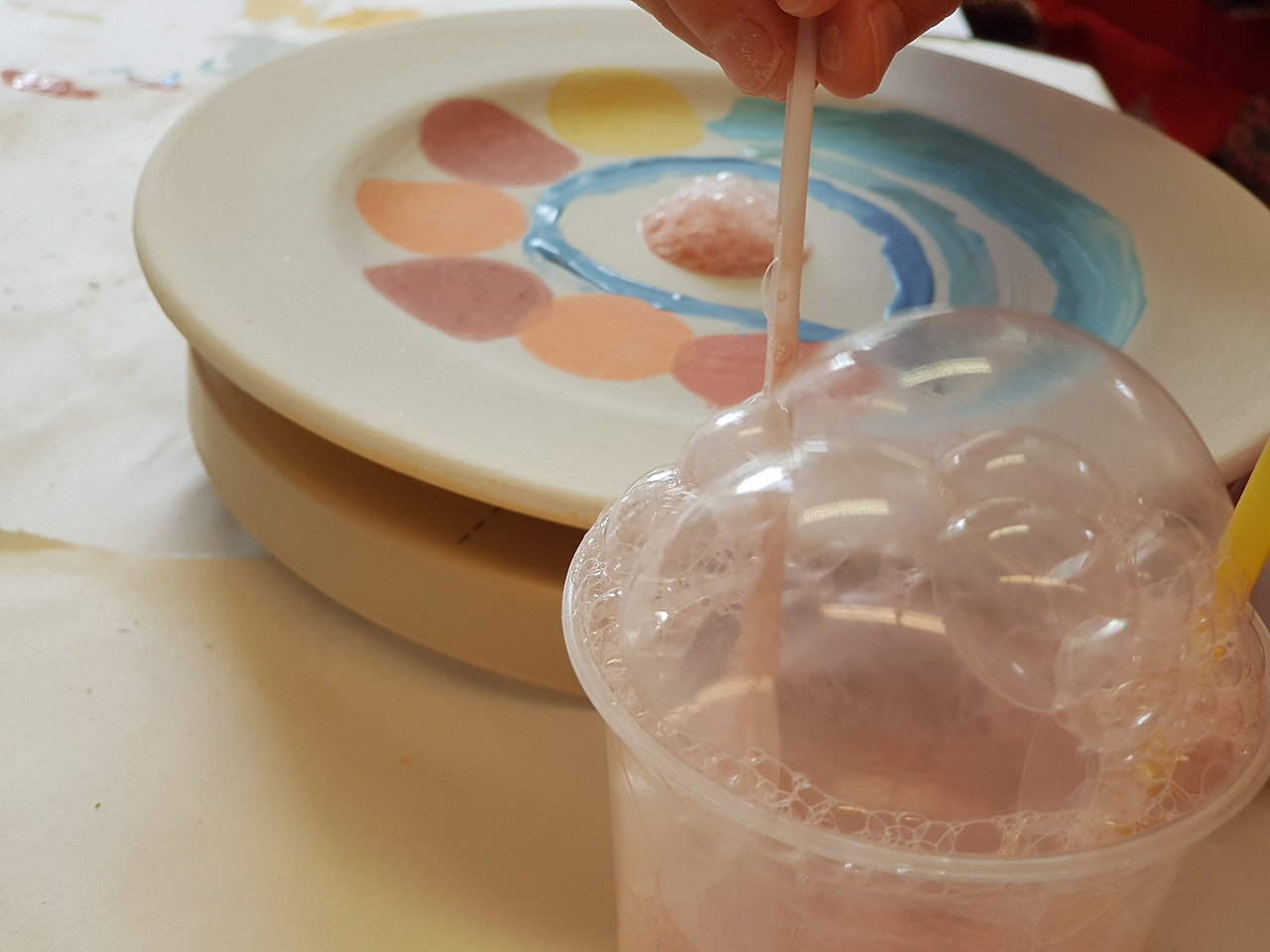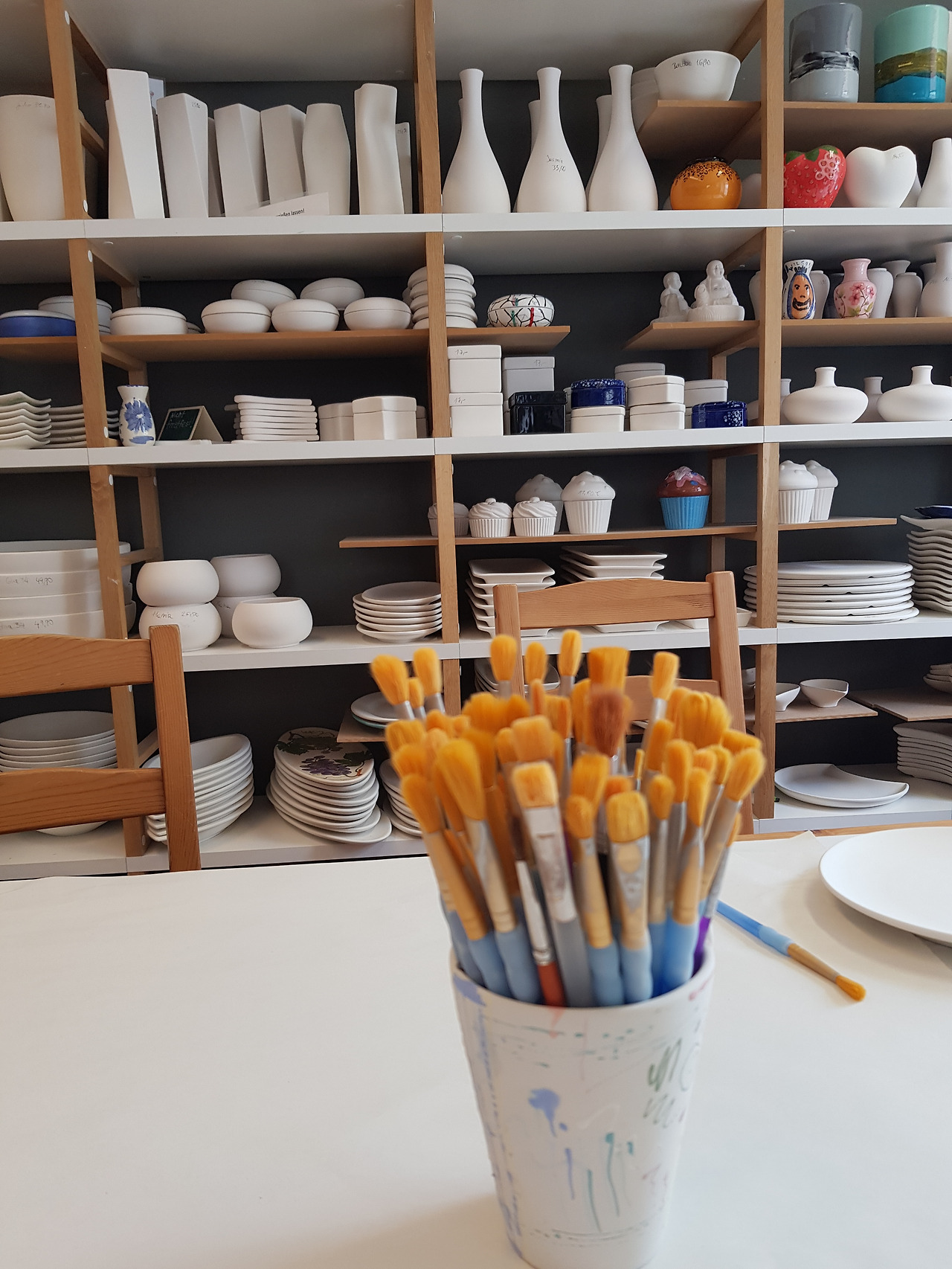공방에서 다섯 아이들을 지켜보며 놀란 건 아이들의 자율성과 창의성이었다. 내가 할 일은 없었다. 만 9세 아이들에겐 반드시 보호자가 1명 있어야 하기에 자리만 지켰다. 아이들은 공방의 담당자에게 붓과 물감 사용 방법에 대한 설명을 들었고, 알아서 원하는 접시 등을 골라왔고, 자기가 좋아하는 색깔과 디자인을 선택했다. 누구도 고민하거나 물어보거나 망설이지 않았다. 가장 놀란 건 카타리나. 접시 안쪽은 스펀지로 찍고, 접시 바깥쪽은 비눗방울처럼 물감 방울을 떨어뜨려 완성하더라는 것.