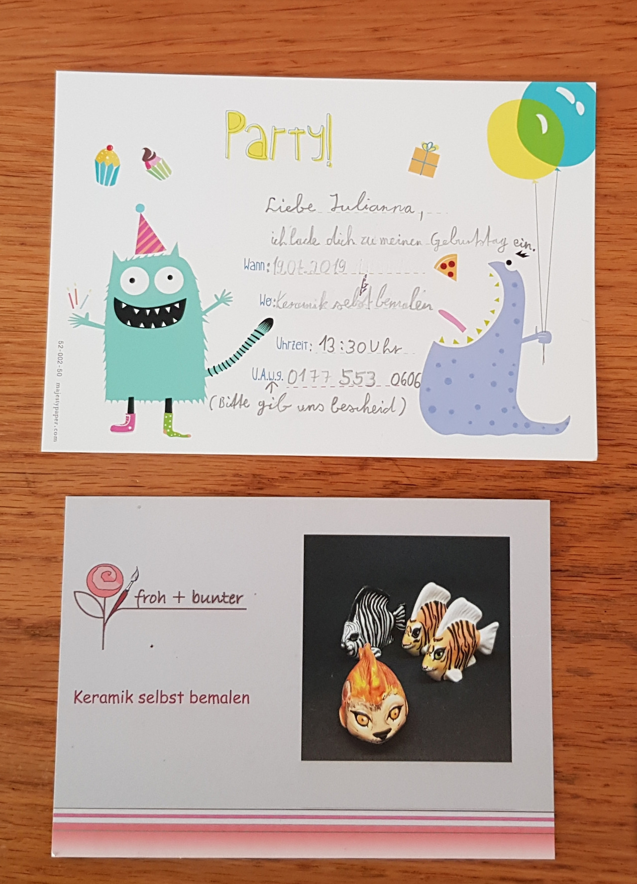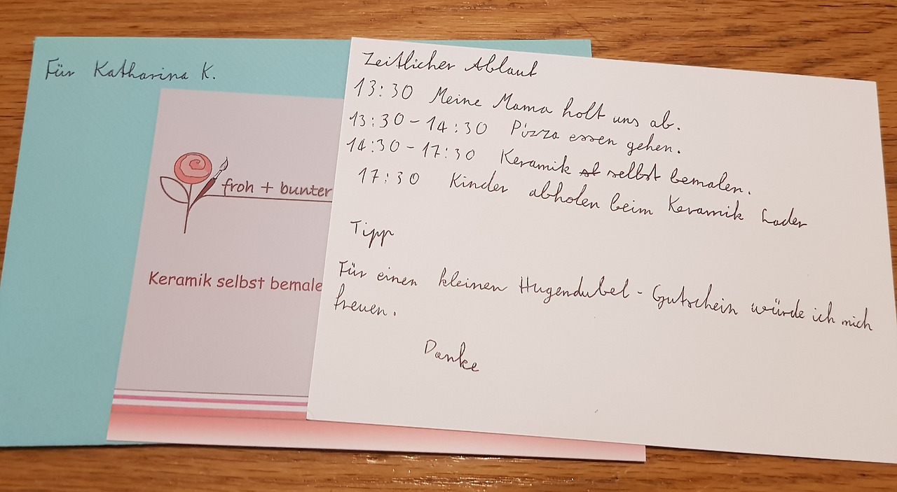 비용은 얼마나 들까. 밥값으로 음료 포함 60유로. 아이스크림과 물 등 추가 비용은 26유로. 공방 비용은 80유로(접시 17유로/ 컵케이크는 15유로) 1주일 후에 구운 접시를 찾을 수 있다. 아이들이 좋아하는 예쁜 투명 지갑에 사탕을 넣어 답례 선물까지 준비했더니 총비용이 200유로 정도. 생각보다 많이 들었지만 후련했다. 아이들도 너무 좋아해서 다음에도 여기 오자고 아이를 꼬셨으나 요지부동. 결정은 자기가 한단다. 율리아나가 하나 더 해도 되냐고 애원하는 걸 다음 생일에 또 오자고 얼렁뚱땅 넘겼건만. 아이의 생일 선물로는 후겐두벨 서점 상품권을 받았다. 고민도 줄이고 실속도 있었다. 아이의 늦은 생일 파티를 하며 결심한 것 딱 한 가지는 내년부터 생일 파티는 절대로, 절대로 미루지 말자!
