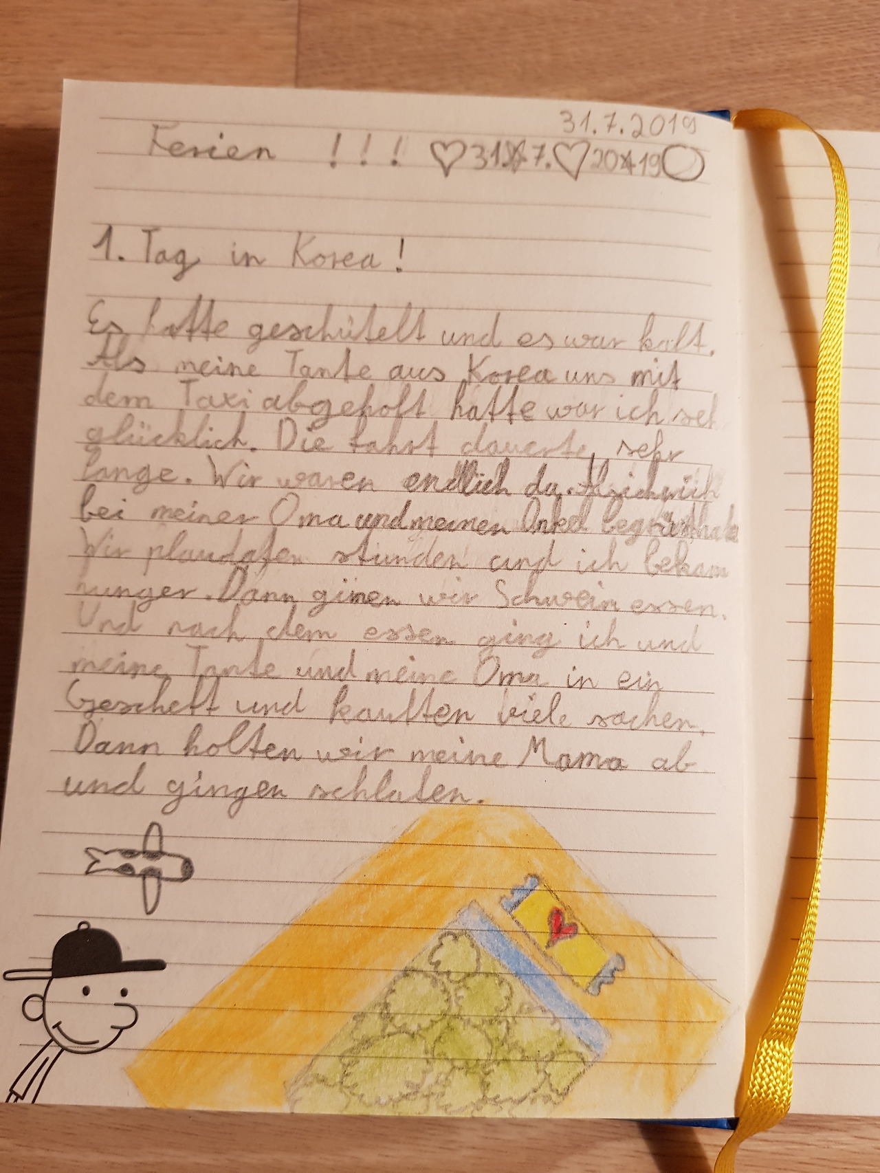 Es hatte geschütelt und es war kalt. Als meine Tante aus Korea uns mit dem Taxi abgeholt hatte war ich sehr glücklich. Die fahrt dauerte sehr lange. Wir waren endlich da. Als ich mich bei meiner Oma und meinen Onkel begrüst habe. Wir plaudaten stunden und ich bekam hunger. Dann gingen wir Schwein essen. Und nach dem essen ging ich und meine Tante und meine Oma in ein Gescheft und kauften viele sachen. Dann holten wir meine Mama ab und gingen schlafen.