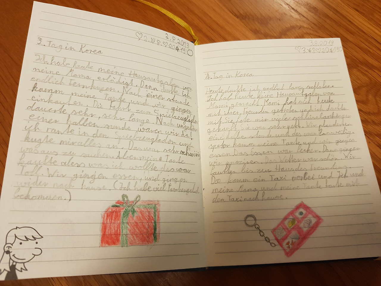 Heute durfte ich endlich lang schlafen. Ich hab heute keine Hausaufgaben von Mami gemacht. Mami hat sicg heute mit ihrer Freundin getrofen und ich durfte mit. Sie hate mir viele schlüselanhänger gekauft. Sie war sehr nett. Wir plauderten eine halbe stunde und das war langweilig. Speter kamm meine Tante und wir gingen essen. Das essen war lecker. Dann gingen wir spaziren. Das wetter war schön. Wir lauften bis zum Haus des Freundins. Da kamm ein Taxi vorbei und ich und meine Mama und meine Tante farte mit dem Taxi nach hause.