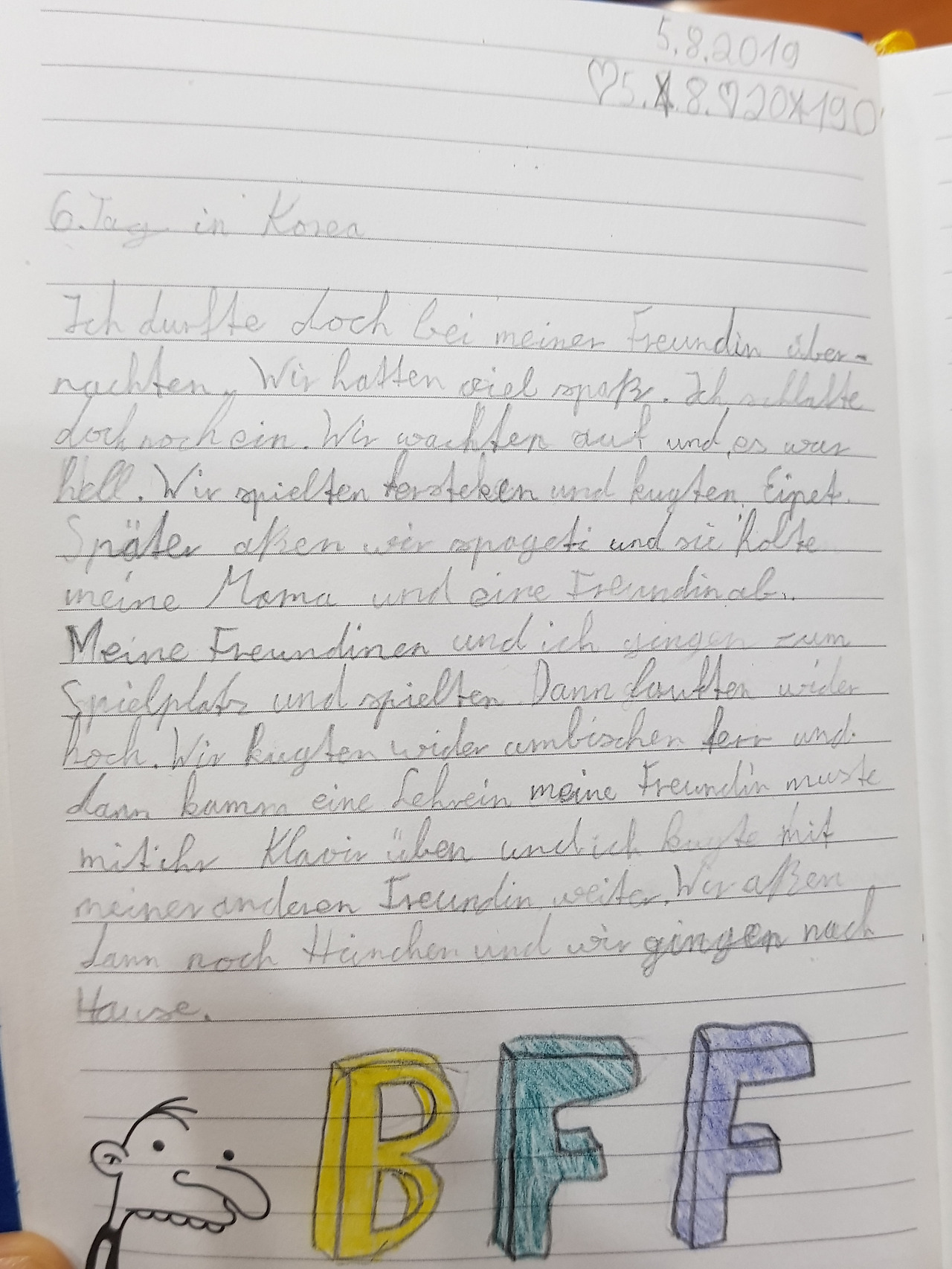 Ich durfte doch bei meiner Freundin überrachten. Wir hatten viel späß. Ich schlafte doch noch ein. Wir wachten auf und es war hell. Wir spielten fersteckenund gugten Eipet. Später aßen wir spageti sie holte meine Mama und eine Freundinen. Meine Freundinen und ich gingen zum Spielplatz und spielten. Dann lauften wider hoch. Wir kugten widereinbischen fern und dann kamm eine Lehrerin meiner Freundinmuste mit ihr Klavier üben und ich kugte mit meiner anderen Freundin weiter. Wir aßen dann noch Hänchen und wir gingen nach Hause.