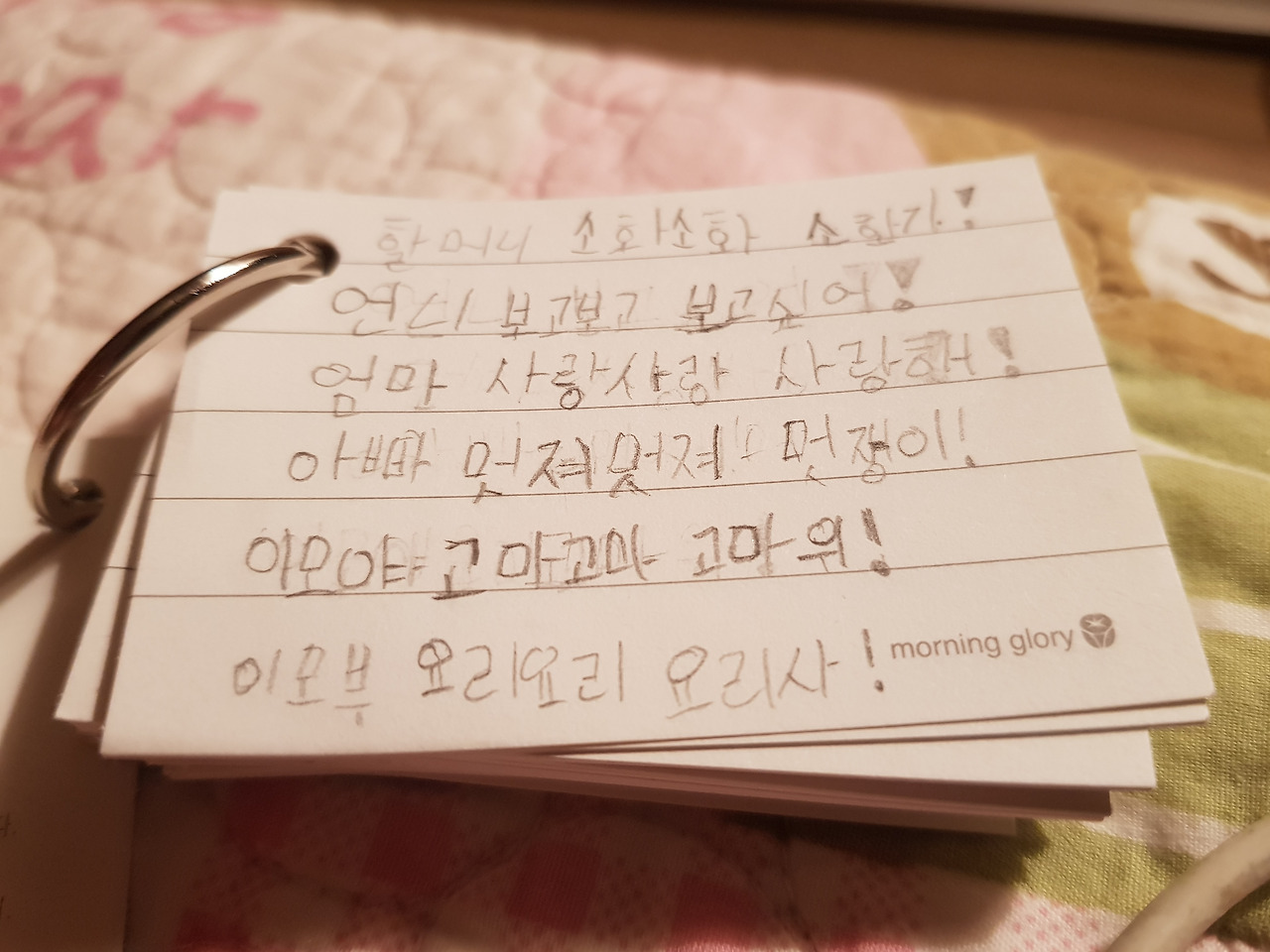 독일에 가서 어떤 알바를 할 지에 대해서도 의견을 물었다. 글쓰기의 루틴을 계속 이어갈 수 있는 일. 글쓰기에 도움이 되는 일. 무엇보다 나이와 건강에 무리가 가지 않는 일. 몇 가지 선택지를 두고 계속 고민해 보기로 했다. 아직 이틀이 남았다. 열 시 삼십 분. 이제 집으로 가야 한다. 오늘은 또 오늘의 일정이 기다리고 있으므로. 어젯밤 아이는 밤늦게까지 일기도 안 쓰고 본인의 창작 활동에 골몰하느라 바빴다. 아이가 쓰고 랩으로 부른 노래는 이랬다. 피곤하다며 결국 일기는 못 쓰고 그냥 잤다.
