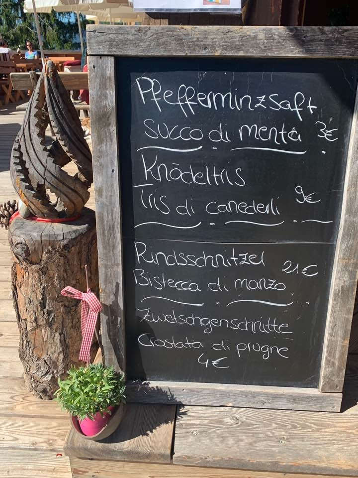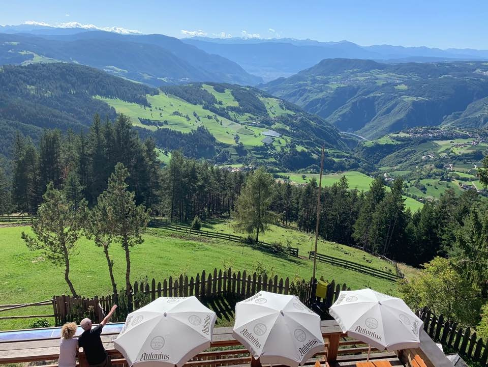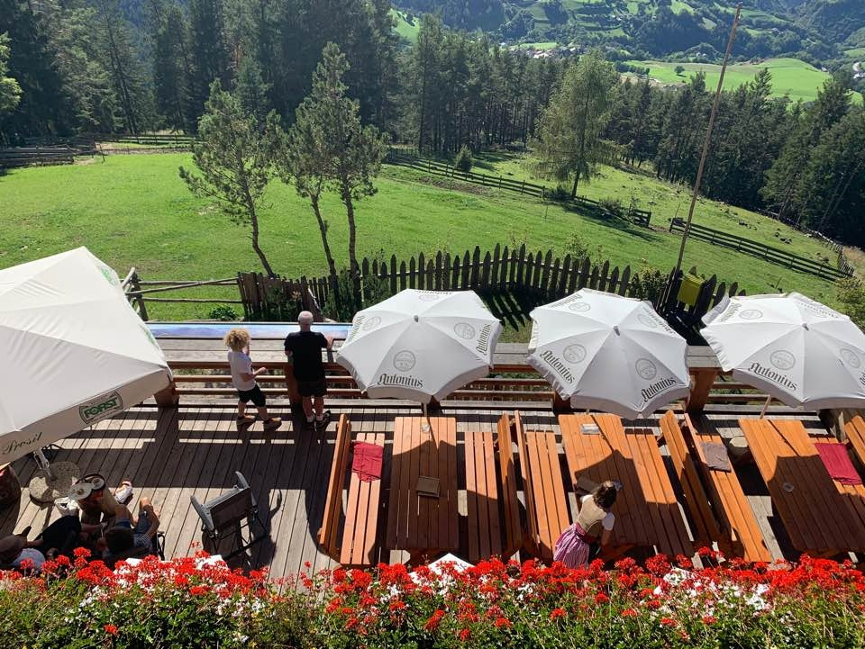 아이와 내 신발은 등산화가 아니었다. 등산화를 살 시간적 여유가 없었다. 이틀은 시차 적응에도 빠듯했기에. 다행히 날씨가 좋고, 미끄러운 곳이 없어 별 탈 없이 올라올 수 있었다. 첫날 아이의 뒤꿈치가 까져 산장에서 밴드를 얻었다. 산장 입구에는 못 신는 등산화를 나무에 걸어놓기도 했다. 둘째 날은 옆산으로 편도 2시간 왕복 4시간의 트레킹을 하기로 했다. 원래는 남티롤의 대표적인 돌로미티 산 중 하나이자 우리 산장에서 수직으로 올라가는 2,457m의 슐레른 자연공원 Schlern-Sciliar으로 갈 생각이었으나 아이도 나도 첫 트레킹이라 옆산으로 등산로를 바꾸었다. 그곳의 정상에는 대피소 겸 산장인 슛츠 하우스 챠폰 Schutzhaus Tschafon이 있다. 높이는 1,737m. 그곳에서 바라보는 남티롤의 두 번째 돌로미티 산인 로젠 가르텐 Rosengarten 산맥이 장관이기 때문이다.로젠 가르텐은 우리 산장에서는 뒷산에 가로막혀 보이지 않는다.