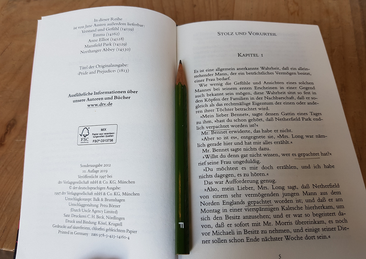그래서 샀나? 샀다. 가격도 저렴하게 12유로였다. 그래서 읽었나? 읽었다. 작년부터 독일어로 된 문학책으로 독일어 완전 정복을외친 이래 성과는 미안하게도 전무후무하다. 변명을 하자면, 아가사 크리스티는 추리물을 안 좋아해서. 이게 말이나 되나. 정직하게 어려웠다고 털어놓자. 독일어샘린다와 <이방인>을 읽은 것만 빼고. 오스틴의 첫 책으로는 <오만과 편견>을 골랐다. 총 60개 챕터라 하루에 두 챕터씩만 읽어나가도 한 달이면 된다. 끝까지 가기만 하면 말이다. 신기한 건 엄두를 냈다는 것. 원래 처음에는 의욕이 앞서서손에 들긴 한다. <마담 보바리>와 <먹고 기도하고 사랑하라>가 대표적. 한두 챕터만읽고 내던진책들이지만 말이다.