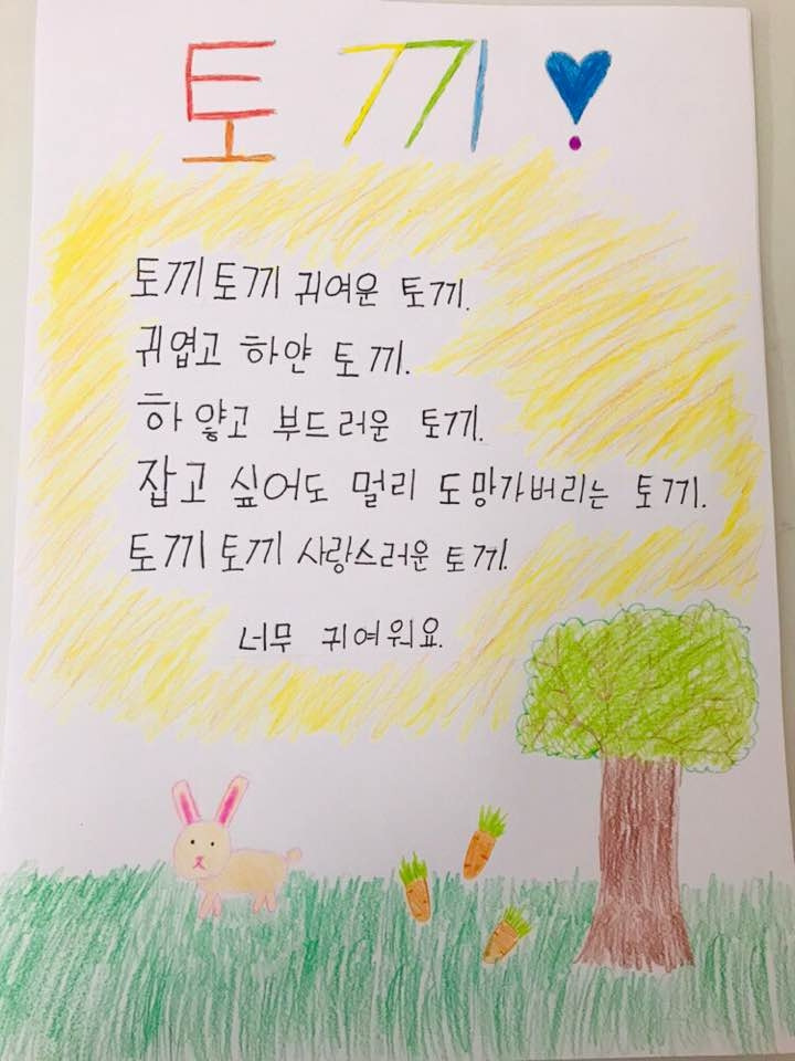 지난 주말에 아이는 한글학교에서 시와 그림을 그렸다. 아이는 태어나서 한 번도 토끼에 대한 일편단심을 저버린 적이 없다. 사랑을 하려면 저 정도는 되어야지. 그러니 토끼에게 시를 한 수 지어 바쳤다 한들 놀랄 일도 아니었다.