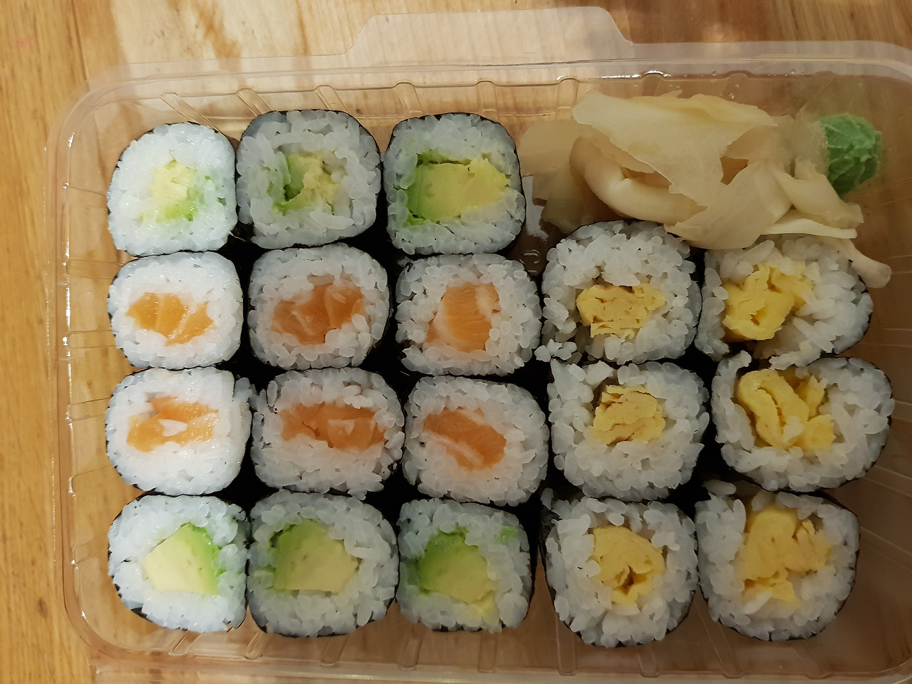 어학학교 교실 밖 풍경과 주2회 아이를 위해 사놓는 스시. 가격은 6개에 3유로. 슈퍼에서 파는 스시 도시락보다 밥이 휠씬 맛있다. 아이가 좋아하는 건 연어와 계란!