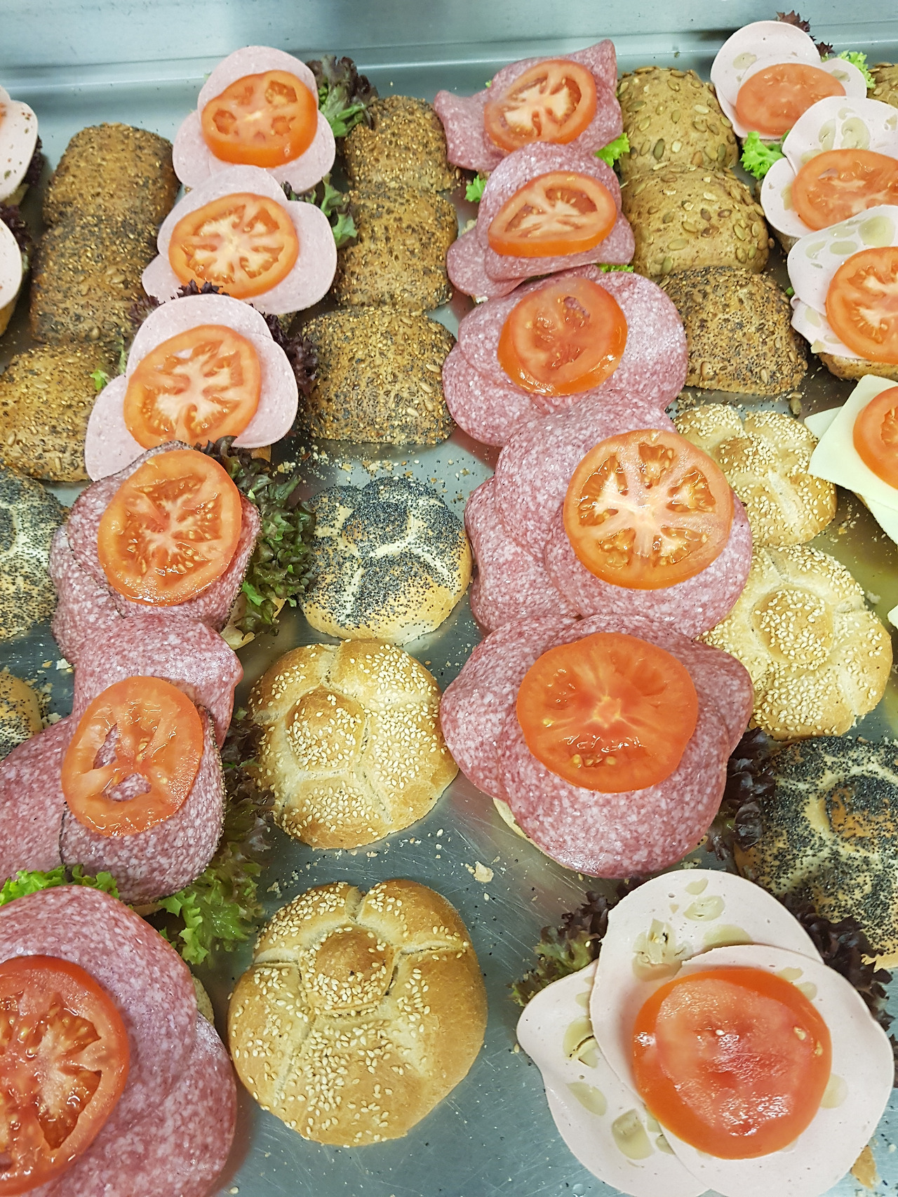 윷처럼 길쭉한 라우겐 슈탕게와 슈피체 빵들에는 각각 모차렐라와 토마토, 까망베르 치즈를 각각 잘라 넣는다. 빵의 양쪽 끝에 상추를 한 조각씩 깔고 가운데에 토마토, 오이를 넣으면 끝. 두 종류의 사각형 갈색 빵 껍질에는 검은깨와 씨앗이 붙어있다. 이런 빵들은 흰 빵 셈멜보다 두 배 이상 비싸지만 맛있고 건강하다. 셈멜에도 흰 깨와 검은깨가 뿌려진 것이 있다. 굽기 전에 촉촉한 빵을 깨를 담은 접시 위에 엎어서 살짝 누른다. 모든 빵에 상추를 깔고 각종 햄, 살라미, 치즈, 토마토, 오이 등을 골고루 넣는다. 신기한 건 스모크 연어 샌드위치. 아침부터 이런 샌드위치를 좋아하는 사람이 있다니. 연어 속에는 흰색의 서양 와사비 Meerrettich 메어 레티히를 넣는다. 바다에서 나는 무란 뜻.