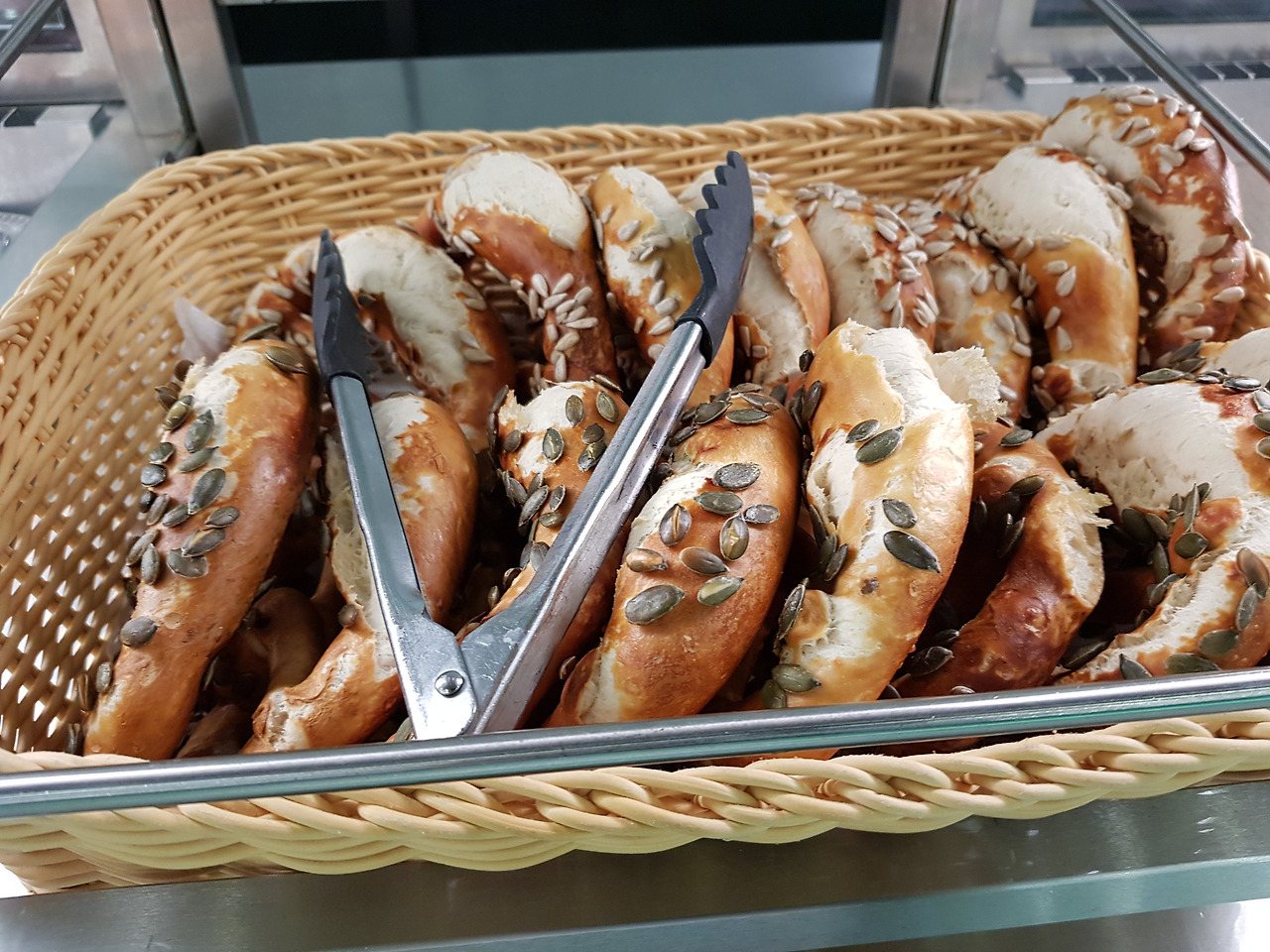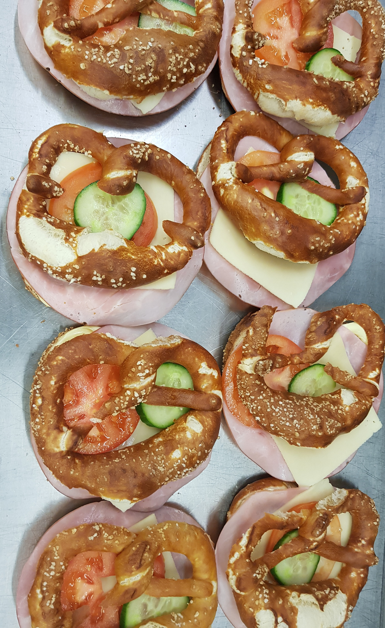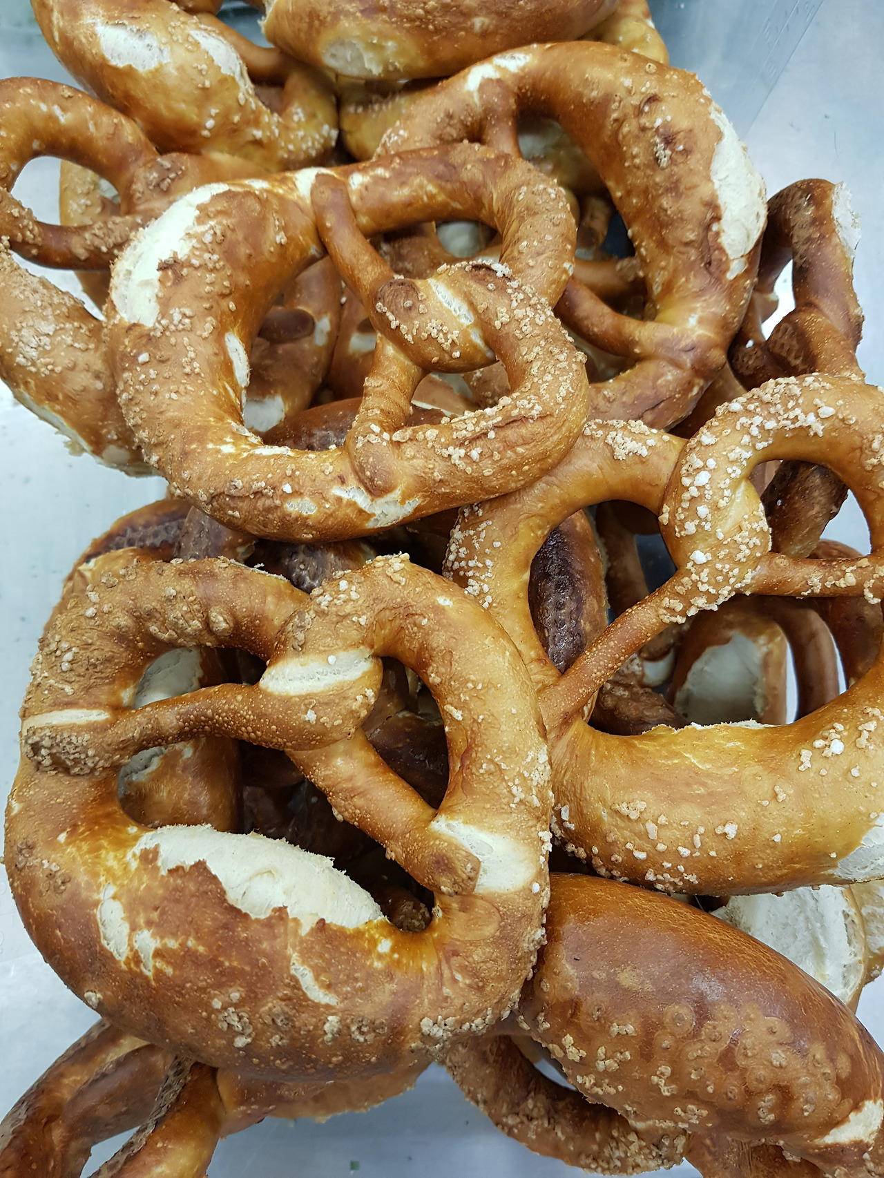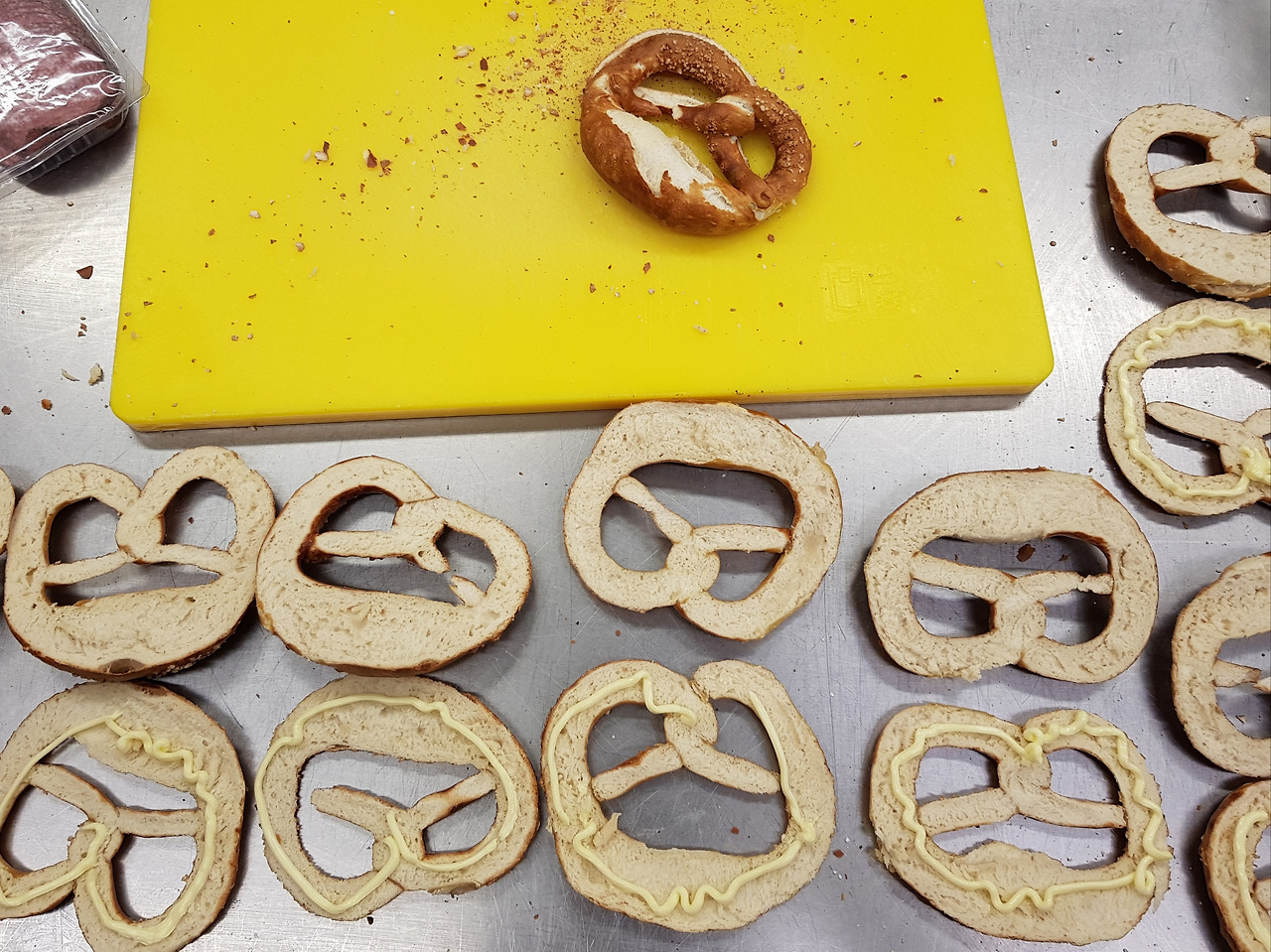 다음엔 브레첼.말했듯이 자르기가 쉽지 않다. 부러지지 않게 잘라야 하기 때문이다. 한쪽이 너무 두껍거나 얇아도 안 된다. 요령은? 무조건 많이 잘라봐야 안다. 너무 따끈해도 너무 딱딱해도 자르기 어렵다. 모든 건 타이밍이다. 빵 하나 자르는 데도 타이밍이 중요하다. 브레첼에도 위아래가 있는줄 몰랐다. 위쪽에 해바라기 씨앗이나 깨가 뿌려진 것도 있다. 가운데에 얇은 살라미나 햄을 깔고 사각 치즈 두 장을 얹어 구운 치즈 브레첼도 있다. 버터 브레첼에는 당연히 버터를 듬뿍 발라줘야 한다. 너무 적게 바른다고 자주 혼났다. 브레첼 샌드위치 중 독일 사람들이 좋아하는 것 중 하나는 잔파를 얇게 다져 버터나 크림치즈를 바른 브레첼에 잔뜩 뿌려 먹는 것. 색감도 산뜻하고 맛도 가격도 그만이다. 독일에 오시면 한번 맛보시길 바란다. 이름은슈니트 라우흐 브레첼 Schnittlauchbrettzel.