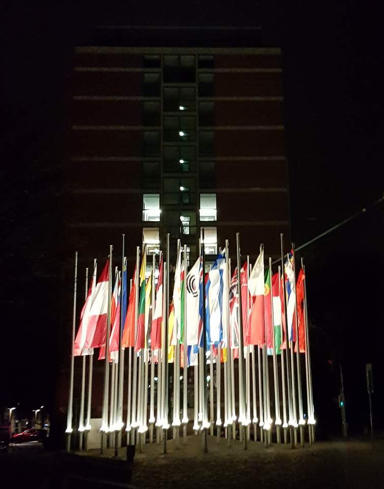 유럽 특허청과 독일 특허청 사이의 깃발들. 뒷쪽 건물이 독일 특허청이다. 내가 일하는 칸티네는 맨 꼭대기층인 10층!