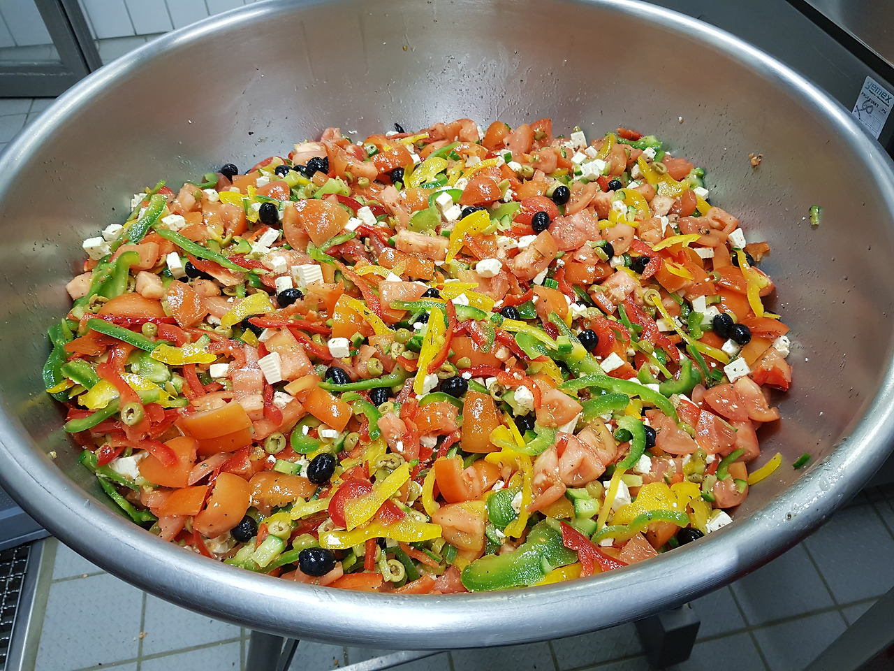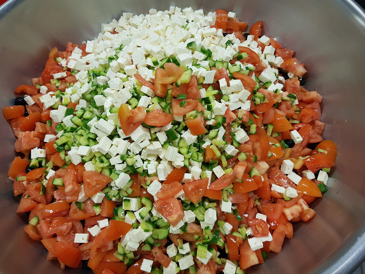 각종 양념통들과 학교급식 배달통들(위) 저 예쁜 색들의 조합! 그리스식 샐러드(아래)