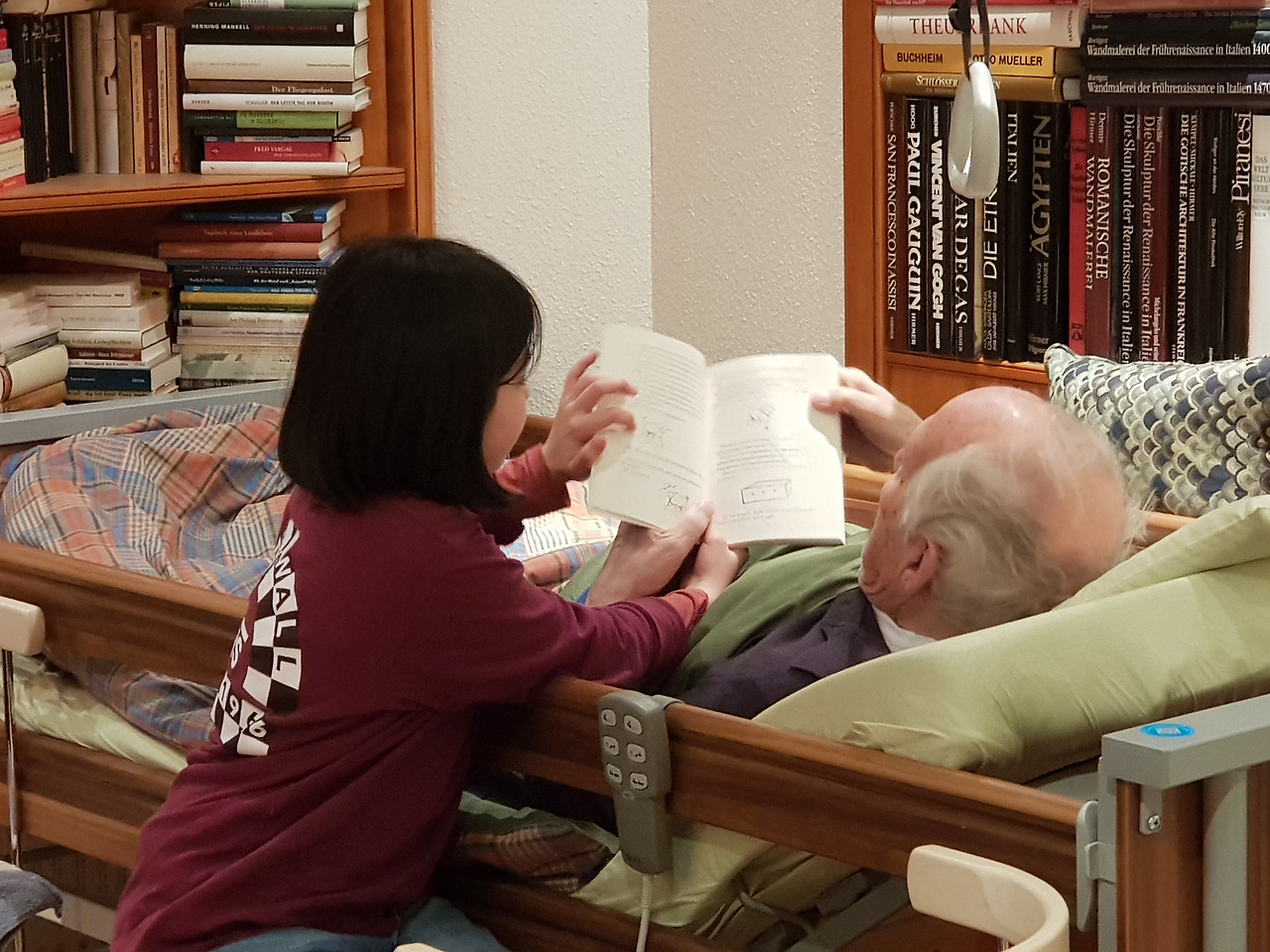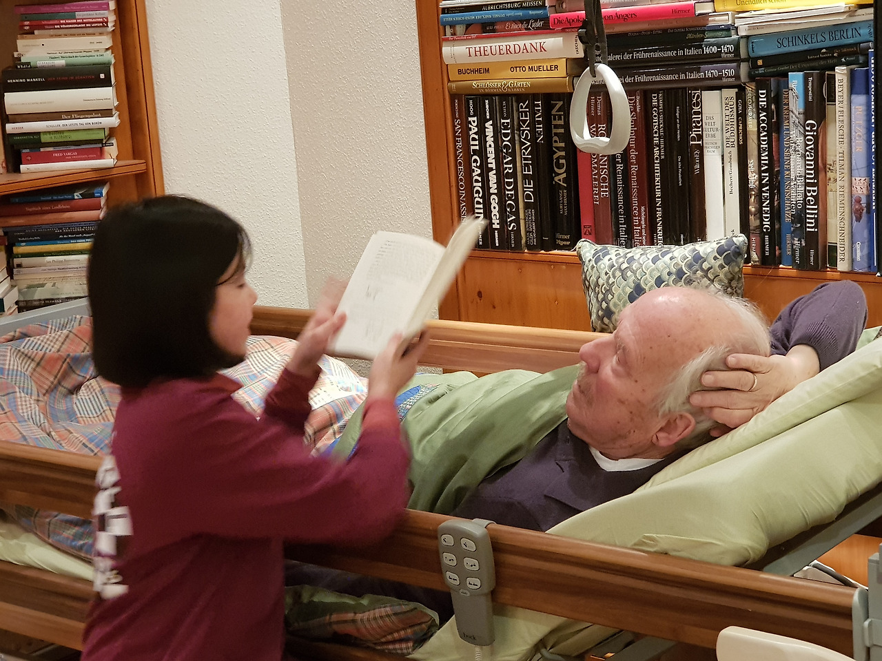 할아버지가 병원에 입원하셨단 소식을 듣던 날 아이는 눈물을 흘렸다. 병원에 계실 때는 시어머니가 독감에 걸리시는 바람에 병문안도 못 갔다.그러므로 오랜 기다림 후의 방문이었다. 시누이 바바라도 같이 갔다. 아이는 침대에 누워계신 할아버지를 위해 큰소리로 책을 읽어드렸다. 어릴 적 내 모습을 보는 듯했다. 병환으로 사랑방에 누워만 계셨던 우리 할아버지. 그런 할아버지께언니와 내가 번갈아가며 책을 읽어 드렸다. 학교에 들어가기도전이었다. 한글은 그렇게 깨쳤다. 시아버지가 기뻐하시며 아이의 머리를 쓰다듬어 주셨다. 손톱을 깎아 드리던 내 머리도 몇 번. 그 옛날 우리 할아버지가 그러셨던 것처럼.