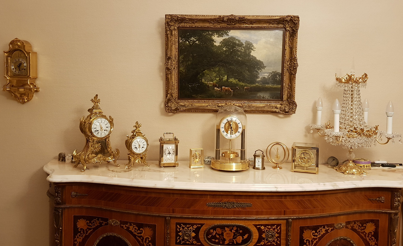시아버지가 몹시도 사랑하시던 물건들. 수동식 시계들, 도자기 피구어들 그리고 샹들리에도 주인의 눈길을 잃어가고 있다.