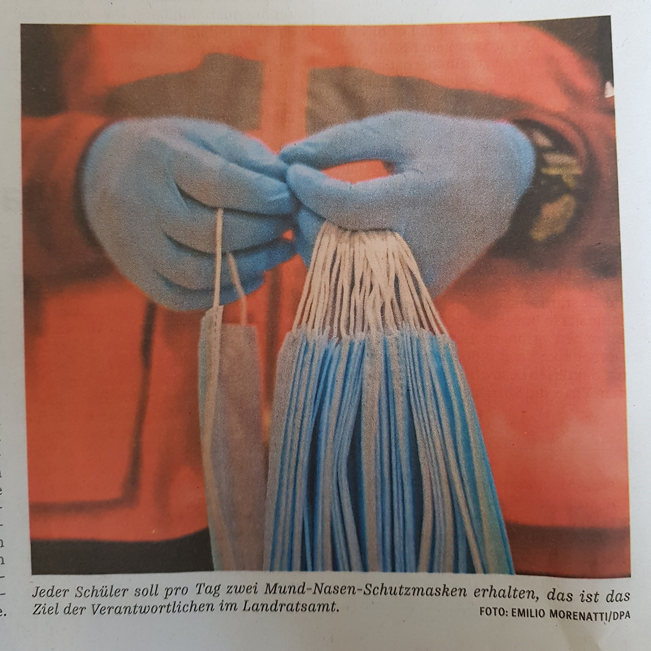 퇴근길(위) 마스크에 관한 신문 기사와 독일의 종이 마스크. 일명 치과용 마스크(아래)