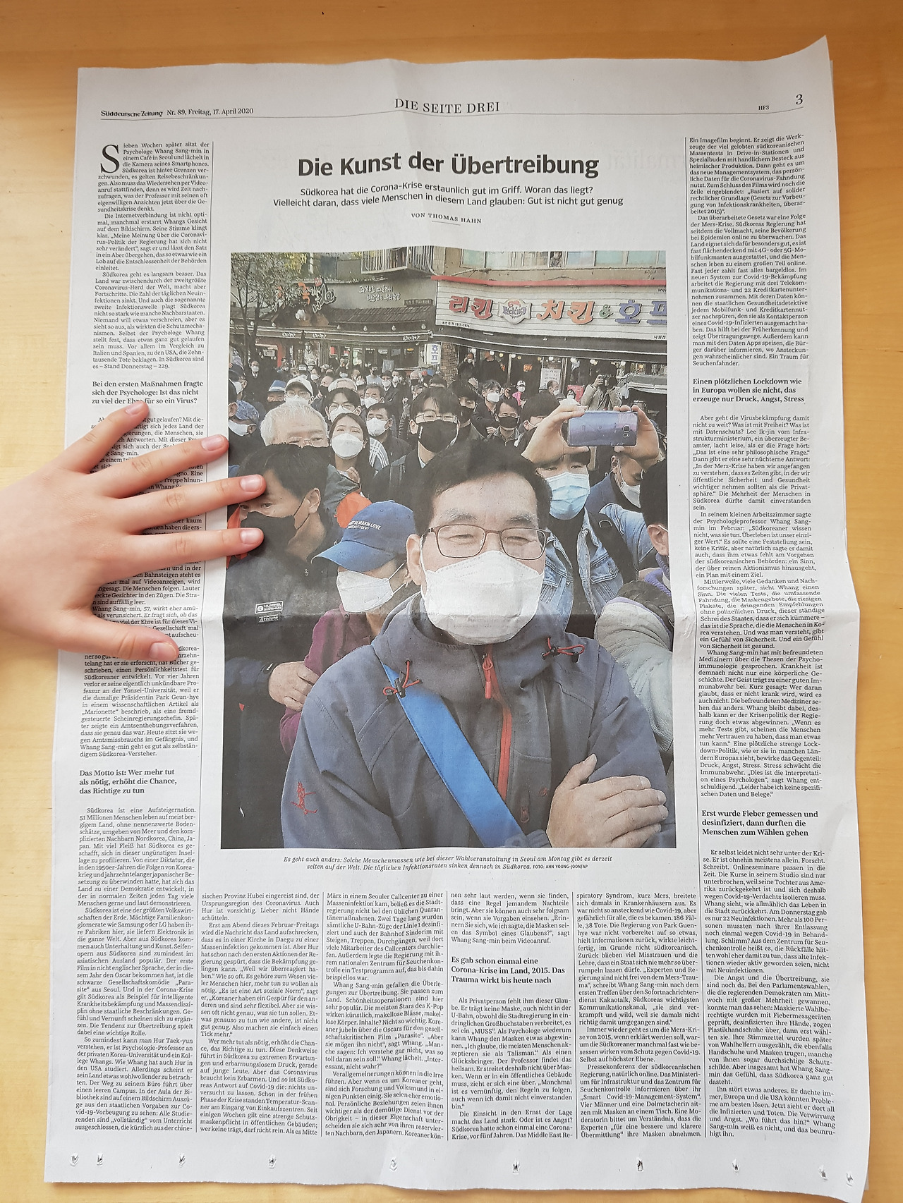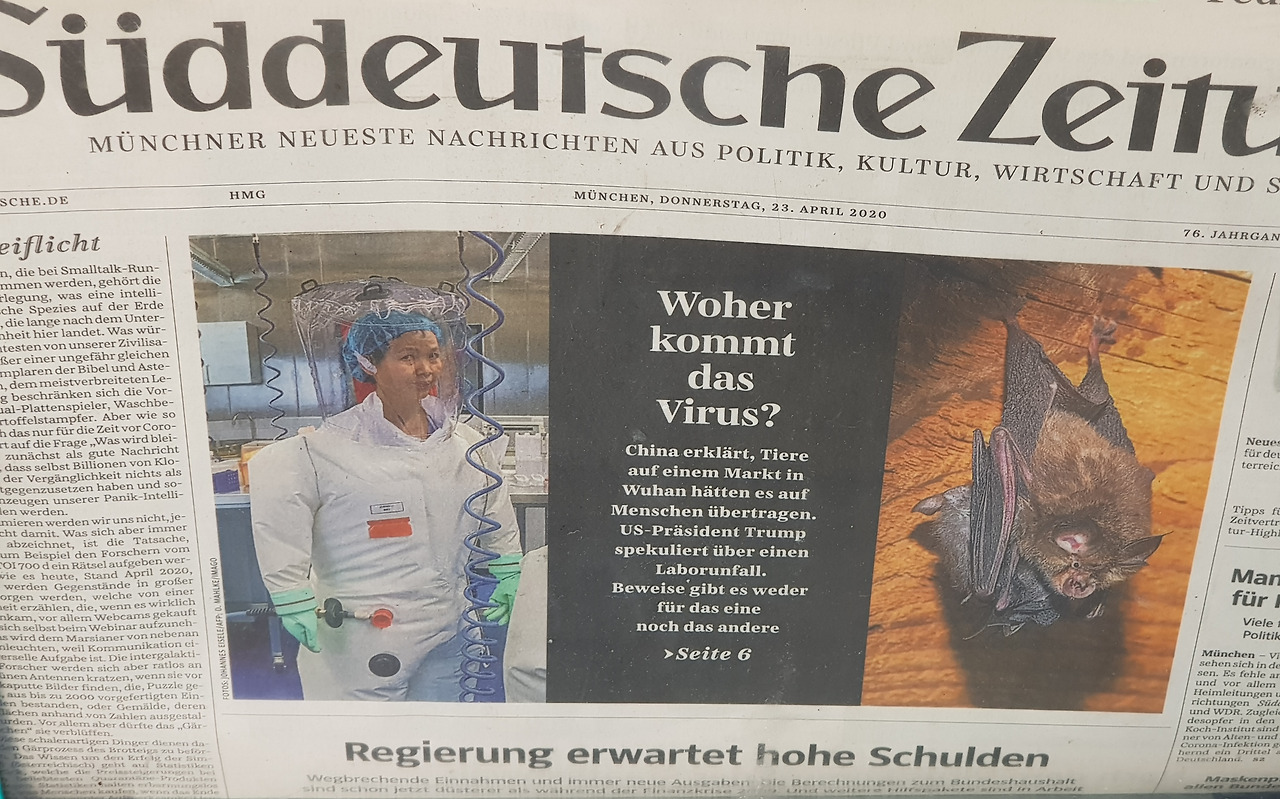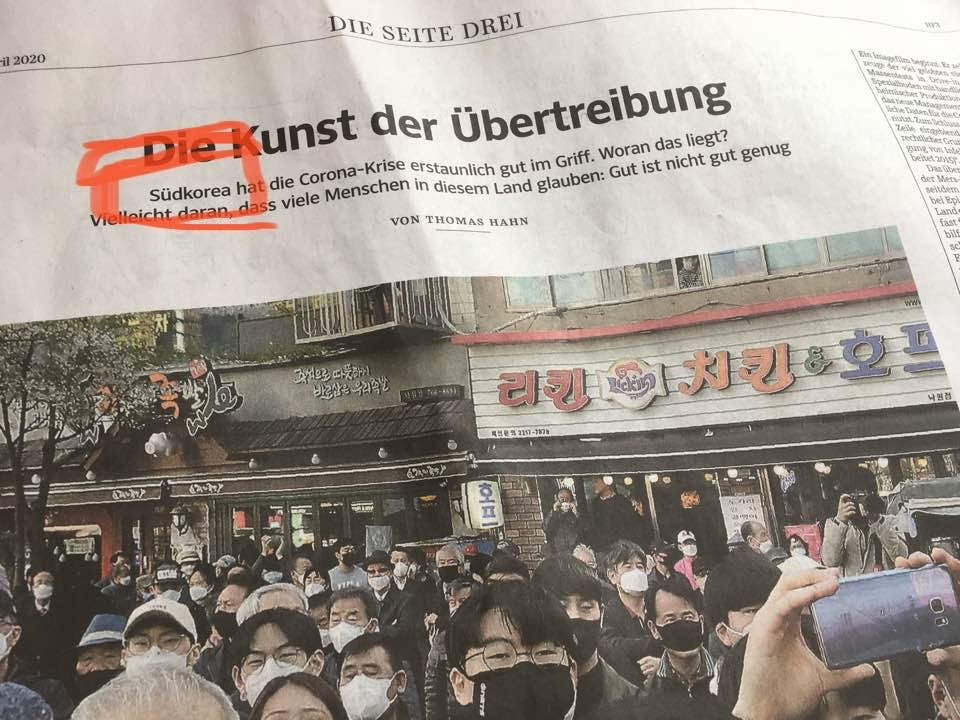 쥐트도이체 차이퉁에 실린 기사들. 중국 코로나 기원설과 5월 개학(위). 한국의 총선을 다룬 기사에 아이가 형광펜을 칠했다!(아래)