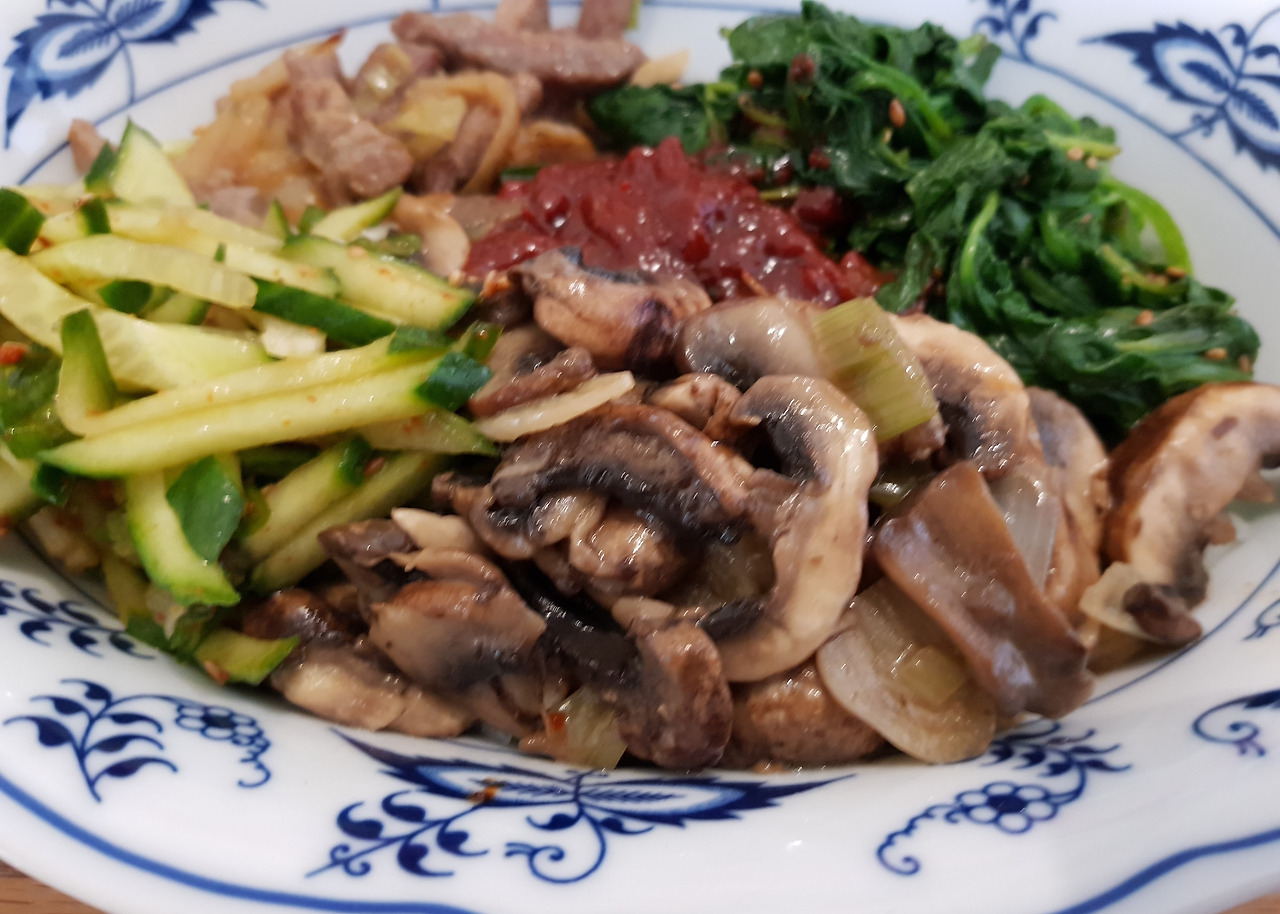 야채 듬뿍 닭죽과 볶은 김치(위) 얇게 썬 목살 혹은 소고기에 야채 볶음. 그리고 내가 사랑하는 비빔밥(아래).(저 야채들 아래 고슬고슬 쌀밥이 깔려 있다!)