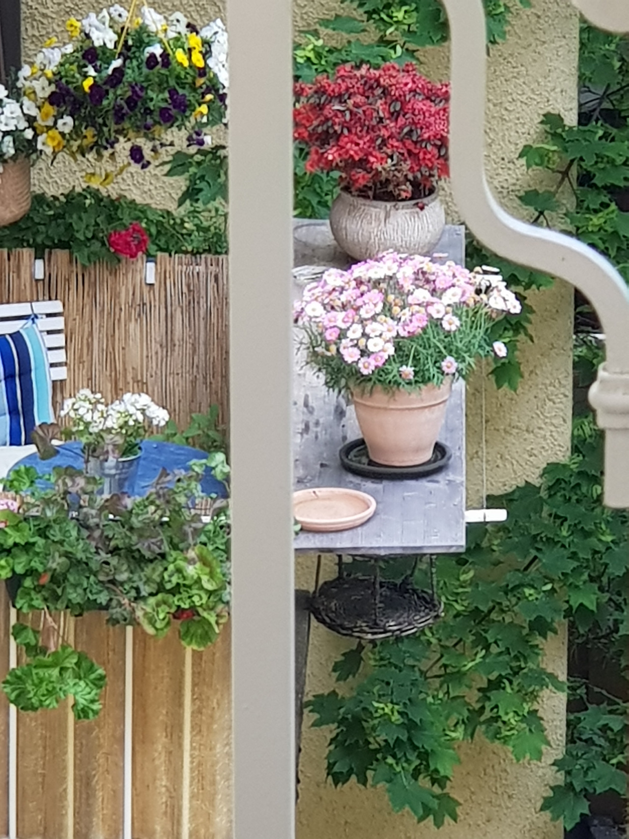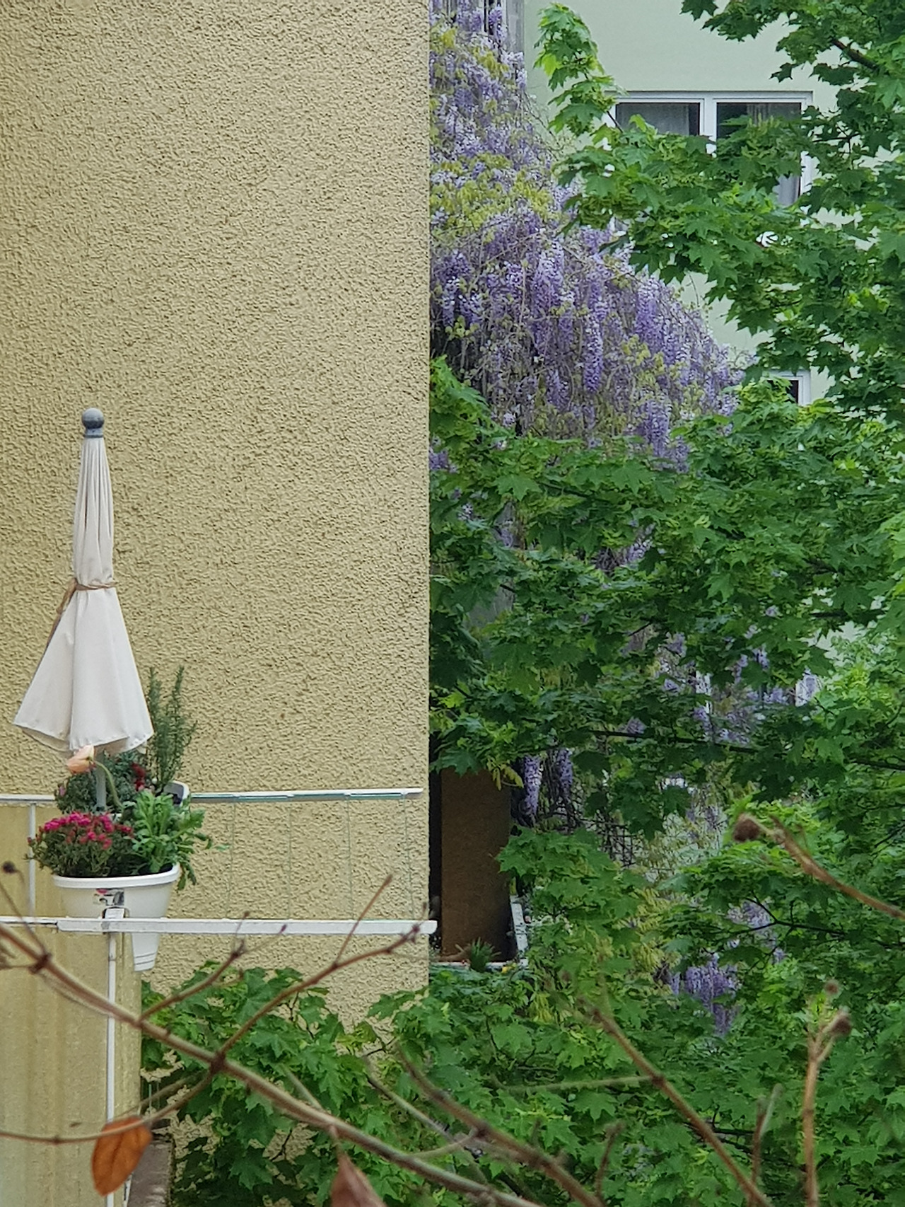 우리 집 건너편 발코니도 예쁘다. 보라꽃은 사월의 라일락. 지금은 지고 없다.