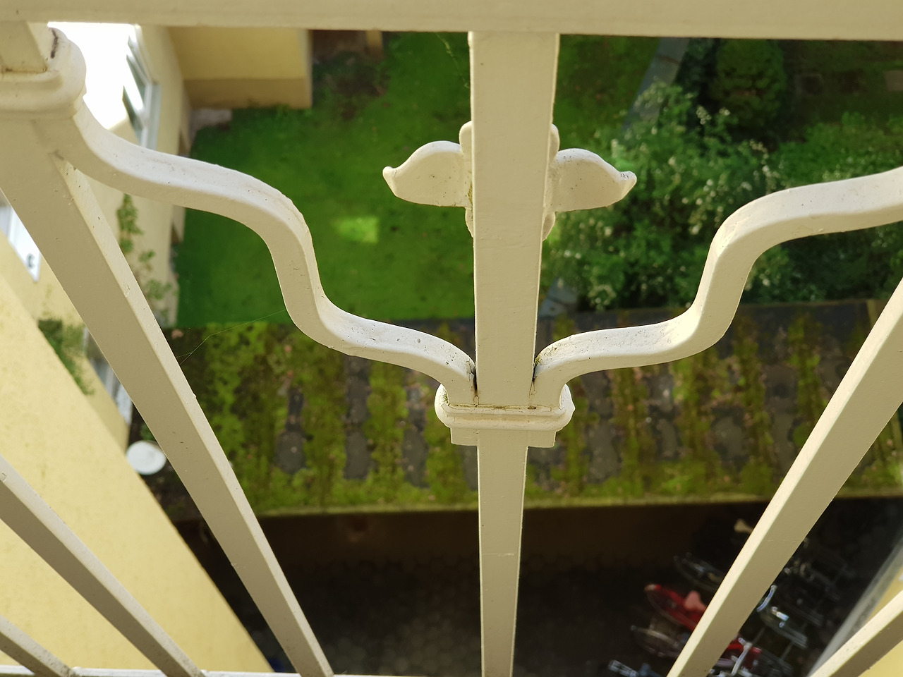 발코니에서 내려다본 뒤뜰. 지붕 아래 쓰레기 분리수거 통들이 있다. 그 앞에는 자전거들 거치대. 우리 자전거 3대도 저기 있다.