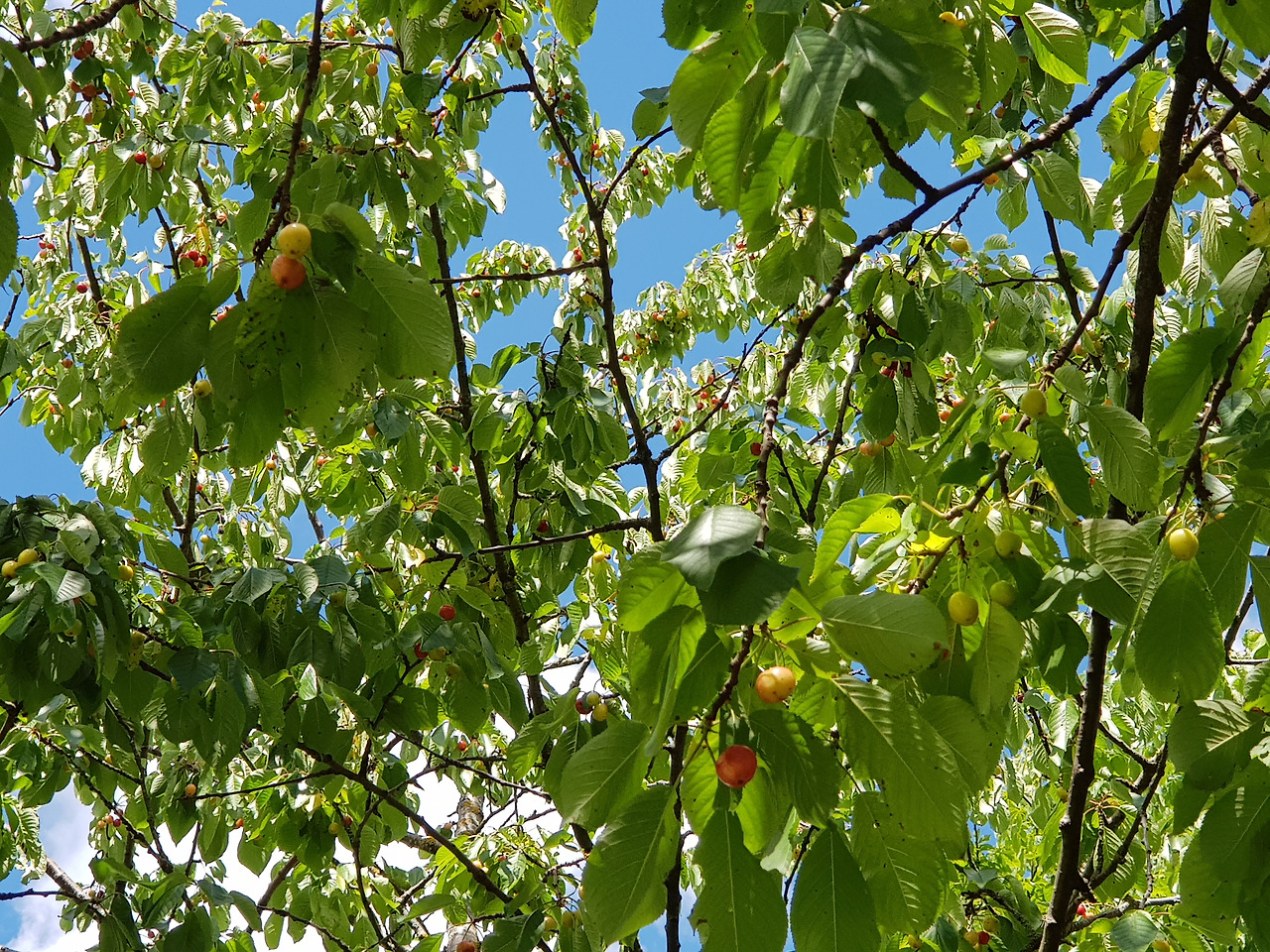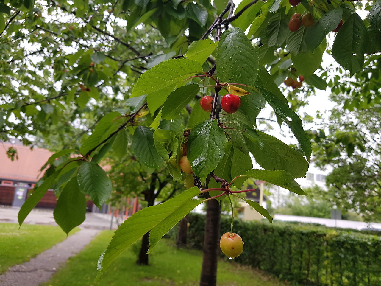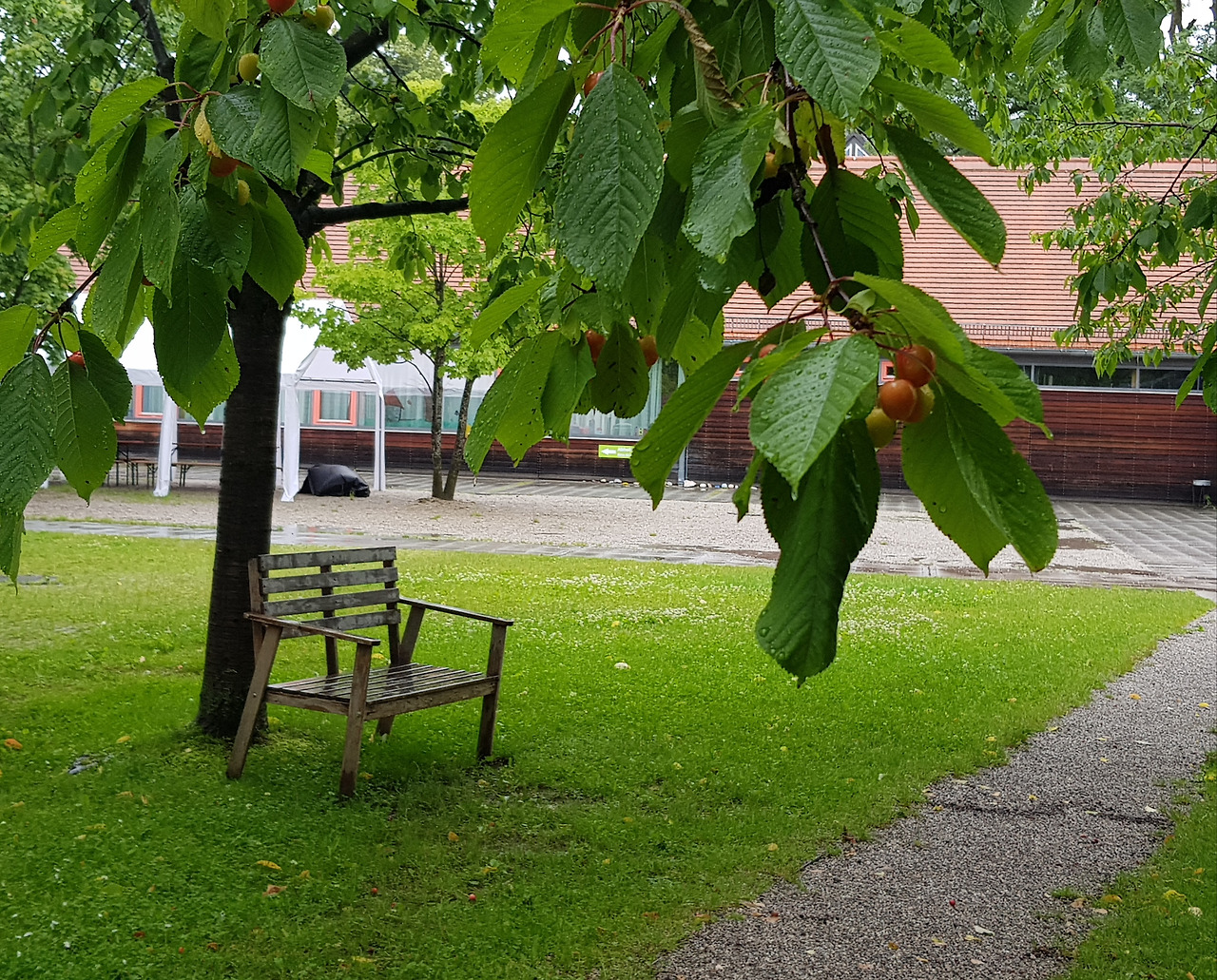 야외 4인석 테이블 벤치에는 못 보던 담요가 놓여있었다. 성당지기 할아버지 말씀으로는 날씨가 좋으면 김나지움 학생들이 가끔 와서 공부를 하고 간다고. 그리하여 조금 떨어진 체리나무 아래에 앉기로 했다. 2인석 벤치에는 햇볕과 나뭇가지 그늘이 반반씩차지하고 있었다. 운 좋게 양해를 구해 함께 앉을수 있었다. 벤치 아래 파릇한 잔디 사이로 빨간 체리들이 구슬처럼 빛났다. 가지마다 덜 익거나 다 익은 체리들이 빼곡했다. 뮌헨의유월은 체리의 계절. 매일매일 달콤하고 새콤한 검붉은 체리를 먹을수 있는 계절.