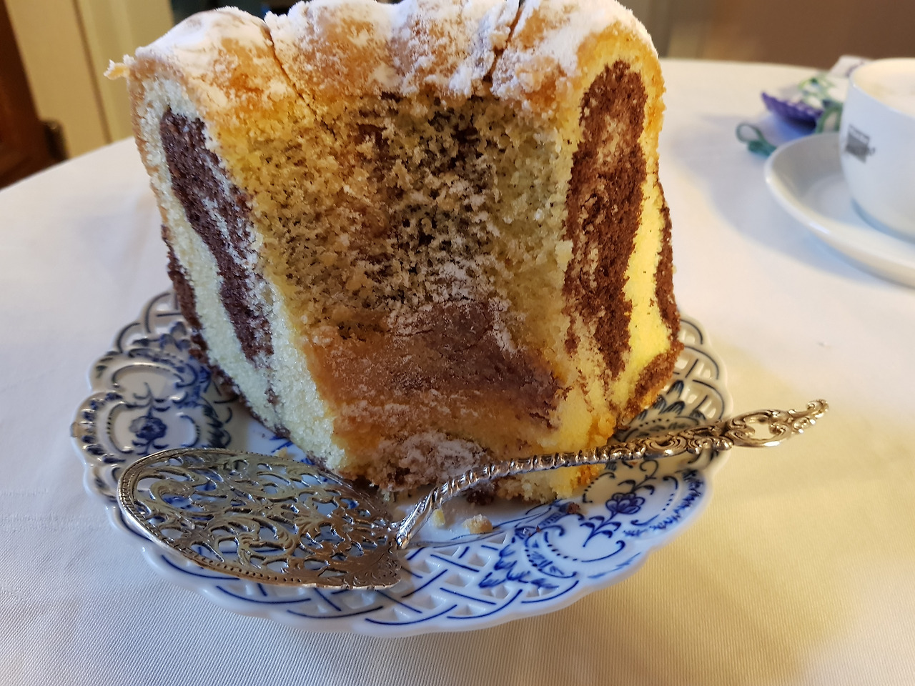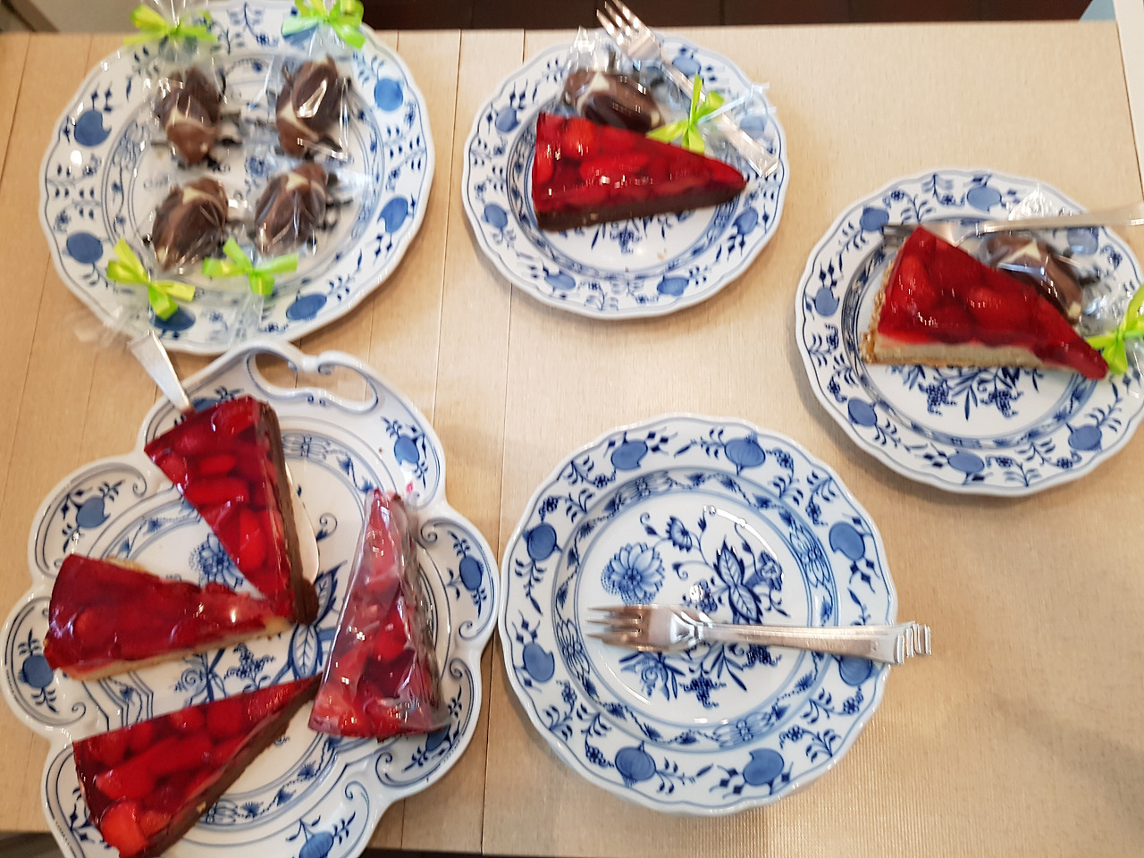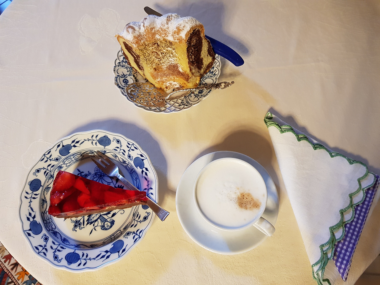 어머니 주방에서 보이는 파란 대문(위). 아이가 좋아하는 딸기 쿠헨과 남편과 내가 좋아하는 마모아 쿠헨(아래).