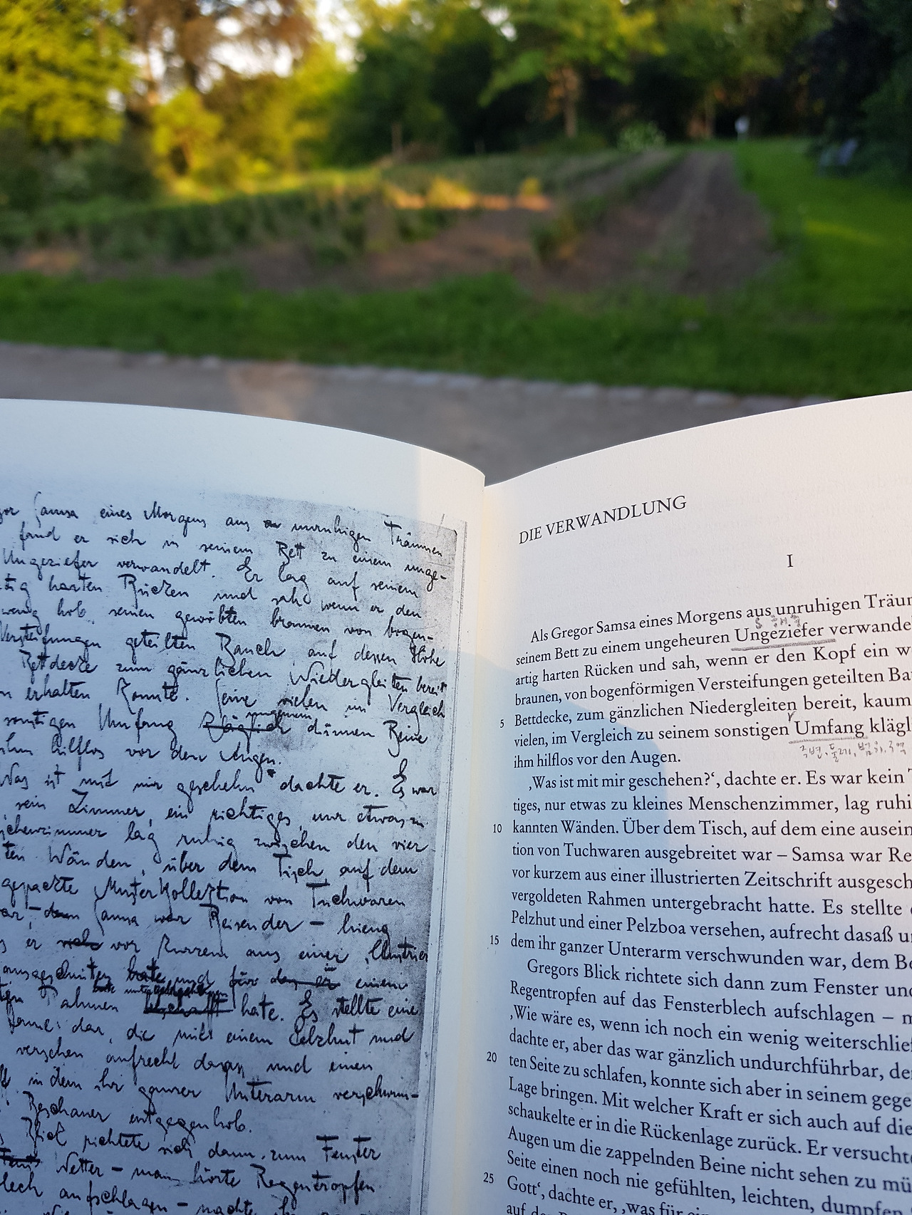장미들의 희비극이 펼쳐지는 무대 앞에서 카프카의 <변신> 한 구절을 펼친다고 예의에 어긋나지는 않겠지. 내일당장 내게도 그런 일이 생긴다면 뭐가 되지? 고민도 해가면서. 새? 나비? 잠자리? 그것도 아니면 물고기? 개미나 벌의인생은 사양하려 한다. 곤충인지 해충인지 등껍질 단단한, 그 누구도 가까이하려 않는 생명체로 변신하고도 새벽 다섯 시 기차를 놓칠까 봐 안절부절 못하는 존재의 가련함이여. 그 장면에서 책을 덮는다. 그레고르 잠자여, 카프카여. 나도 그 시간에 뮌헨 지하철 우반을 타러 간다. 카프카 대신 까뮈의 <이방인>을 들고 왔어야 했나. 뭐가 다른가, 카프카나 까뮈나.묵직하게 마음이 아파오기는 마찬가지.