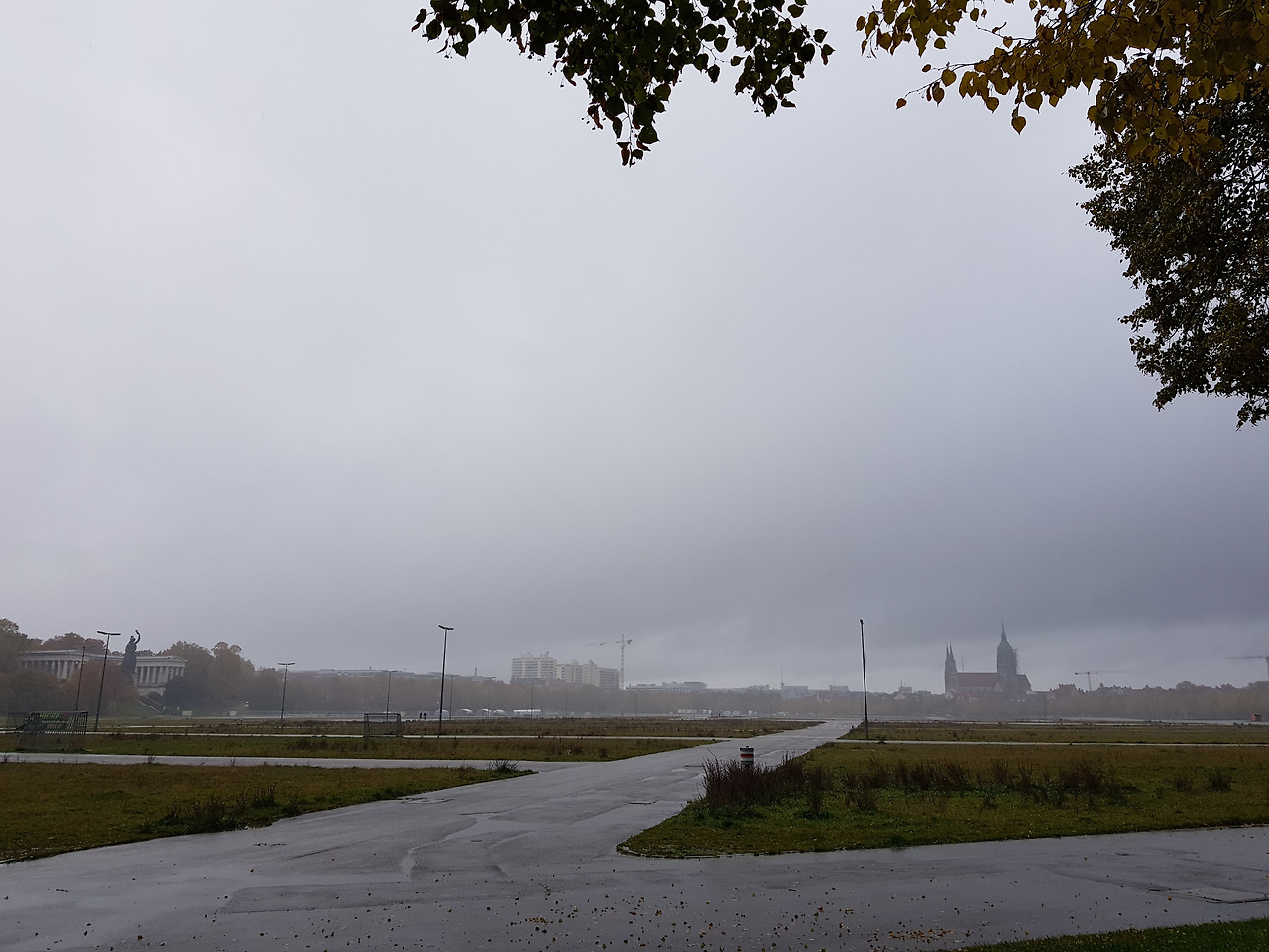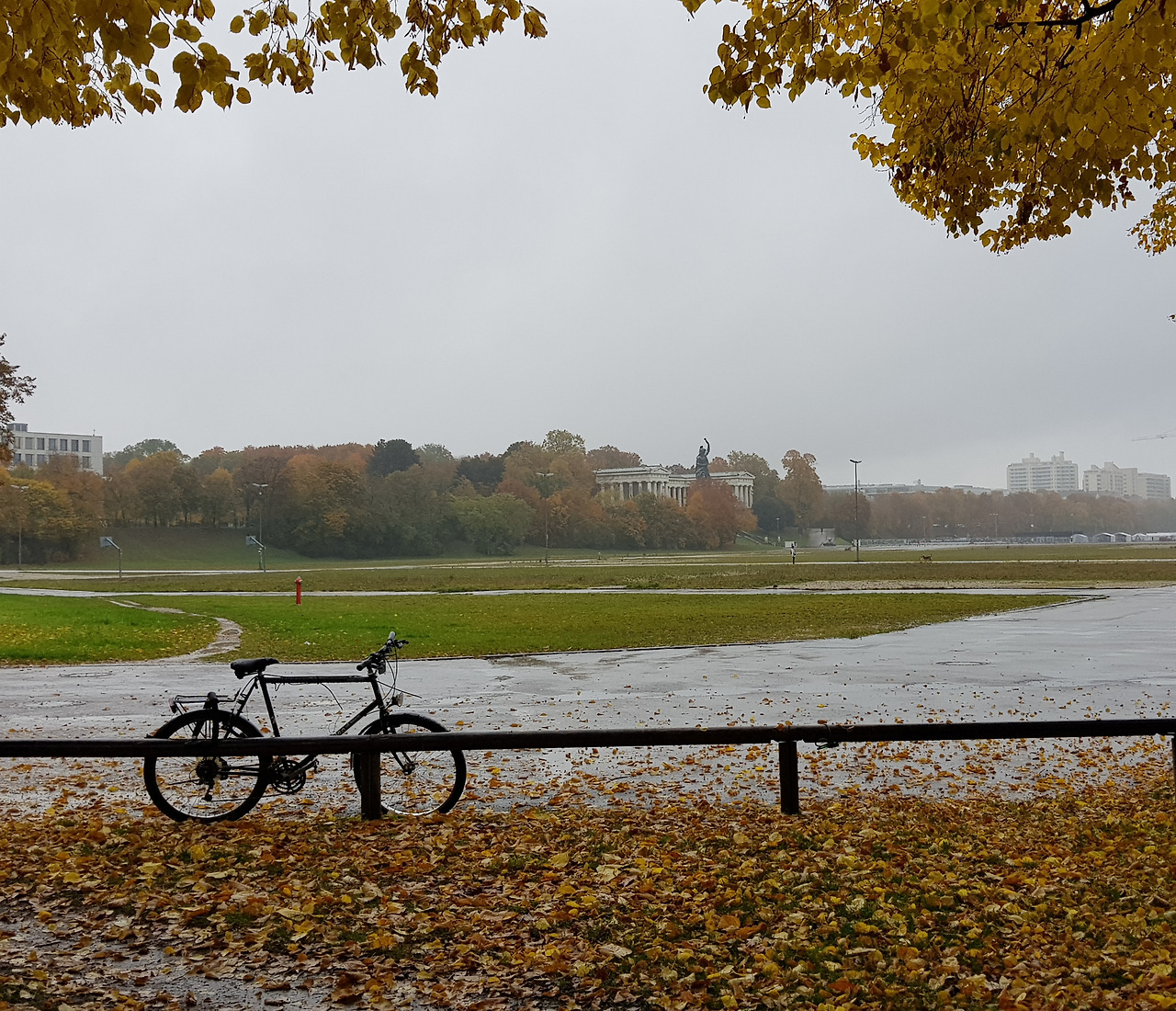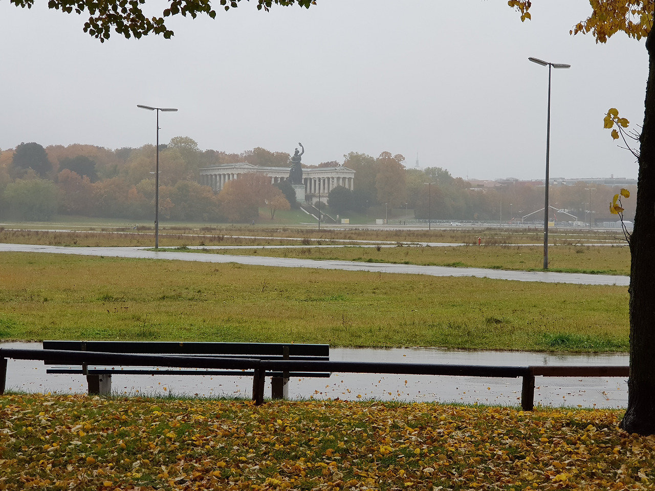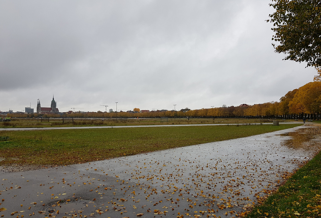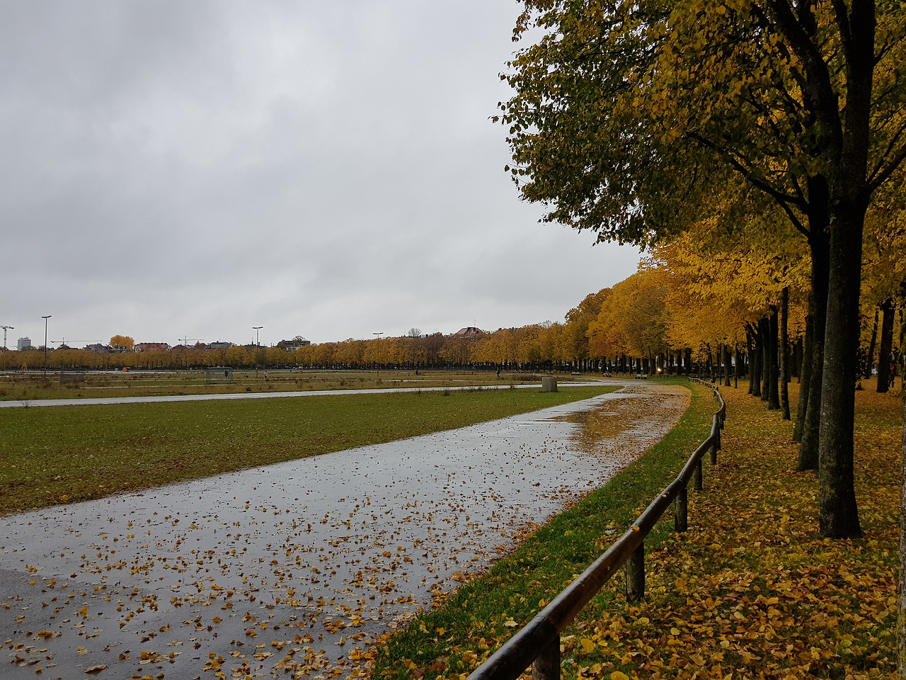 아이와는 한글학교 지하철 역앞에서 헤어졌다. 토요일 오전3시간의 자유가 손안에 쥐어지는 짜릿한 순간이었다. 무엇을 할 것인가. 평소대로 카페로 직행하지 못한 건 노란 물결 때문이었다. 한글학교에서 옥토버 페스트 장소는 멀지 않다. 지하철 역에서 한 블록만 걸어가면 된다. 그 다음 눈 앞에 펼쳐질 들판은 테레지엔 비제 Theresienwiese.지금까지 왜 그 생각을 못했을까. 그곳의 산책길을잊고 살다니. 맑은 날들 다 지나고 비 오는 어제서야 생각이 나다니. 비 오는 날 사진이 제일 차분하리란 내 예상은 들어맞았다. 저 길들, 저 낙엽들을 못 봤으면 어쩔 뻔했나!