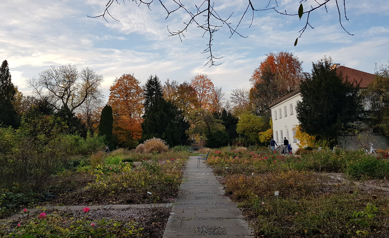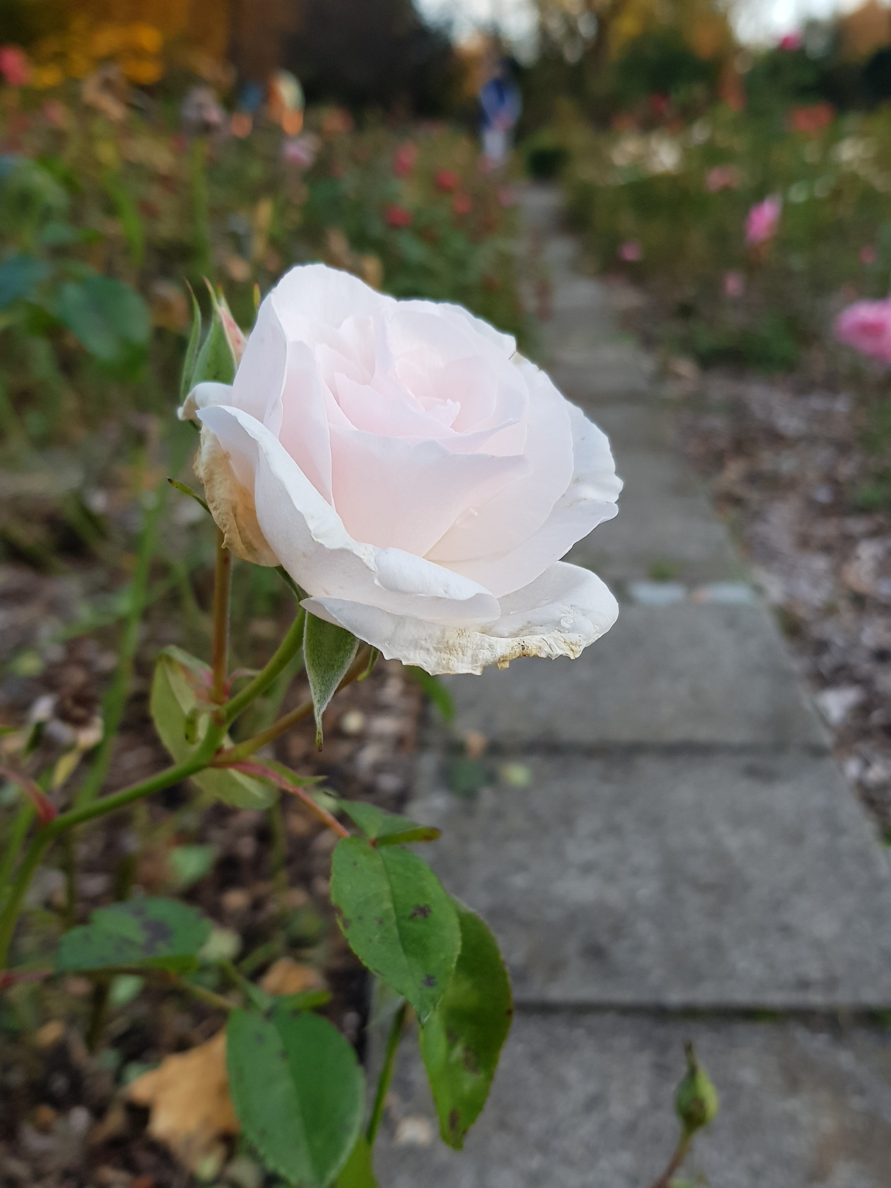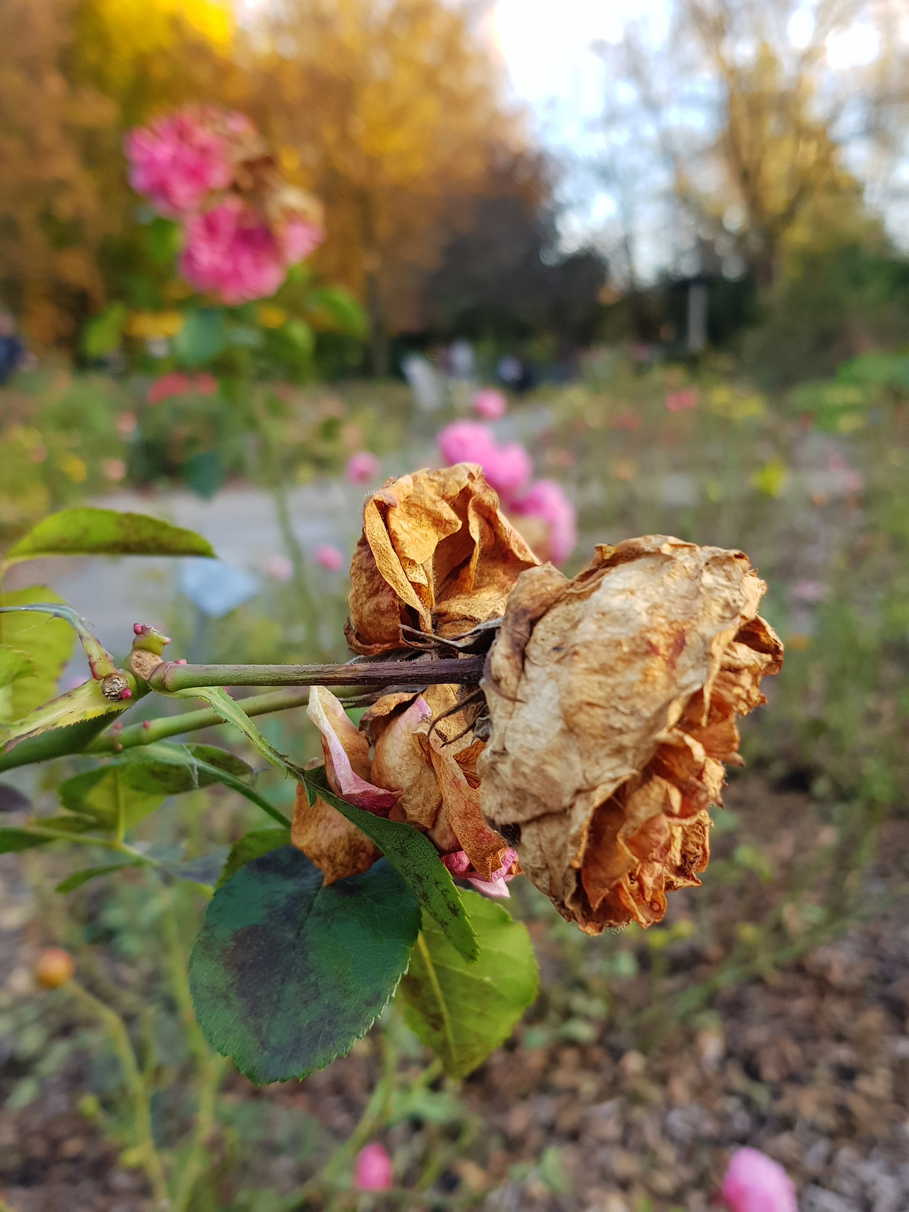 드디어 로젠 가르텐에 도착했습니다. 텅 빈 장미 정원에 남아 있는 몇 안 되는 장미들. 갈색으로 말라버린 장미들. 제가 걱정한 대로였어요. 너무 쓸쓸할 것 같아서 안 보고 싶은 마음도 컸지만 직접 보니까 오히려 담담해지더군요. 아직도 남아 있는 장미들이 대견할 뿐이었지요. 그 곁에 쪼그리고 앉아 오래 들여다보았답니다. 폰으로도 담고, 눈으로도 담고, 가슴에도 새기면서요. 내년 봄에도 꼭 다시 만나자, 약속은 이루어지겠죠? 고개를 들어보니 사시사철 푸른 나무와, 빨갛고 노랗게 물든 큰 나무와, 잎을 다 떨구고 빈 가지뿐인 나무와, 높고 먼 하늘과, 그 하늘에 갈지자로 제 맘대로 붓칠 하는 구름과, 오후 네 시 반 밖에 안 됐는데 절반쯤 생기를 잃어가는 햇살과, 마지막 햇볕을 받아 주황빛으로 빛나는 로젠 가르텐 건물 지붕과, 그 햇살을 마주 보며 앉아 있는 사람들과, 장미 사이를 뛰어다니는 아이들 웃음소리와 그 모든 것이 하나씩 둘씩 느리게 제 안으로 들어왔어요. 시월과는 그렇게 작별을 했답니다. 뮌헨의 로젠 가르텐에서요.