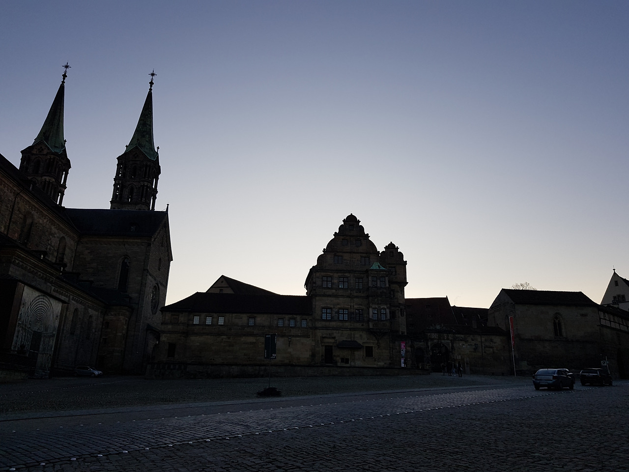 구시가지의 언덕 위에는 대성당, 대성당 옆에는 소박한 구궁전이 있다. 지금은 역사박물관이 되었다, 맞은편의 웅대한 신궁전은 국립 도서관과 국립 미술관으로 변모했다. 신궁전 안뜰에는 장미 정원. 질서 정연하게 정돈된 로젠 가르텐이 있다. 누구나 들어갈 수 있다. 정원의 돌담 너머로 단정한 밤베르크의 전경이 압권이다. 궁전에는 가톨릭 주교가 살았다. 1007년 신성로마제국 황제 하인리히 2세가 이 지역을 주교령으로 만든 후 주교들이 지배했다. 하인리히 2세는 사후 밤베르크 대성당에 안장되었다. 흑역사도 있다. 17세기 마녀 재판과 관련 1,000여 명이 처형되었다. 1627년 세워진 마녀 감옥은 없어지고 일부 기록으로만 남아있다.**