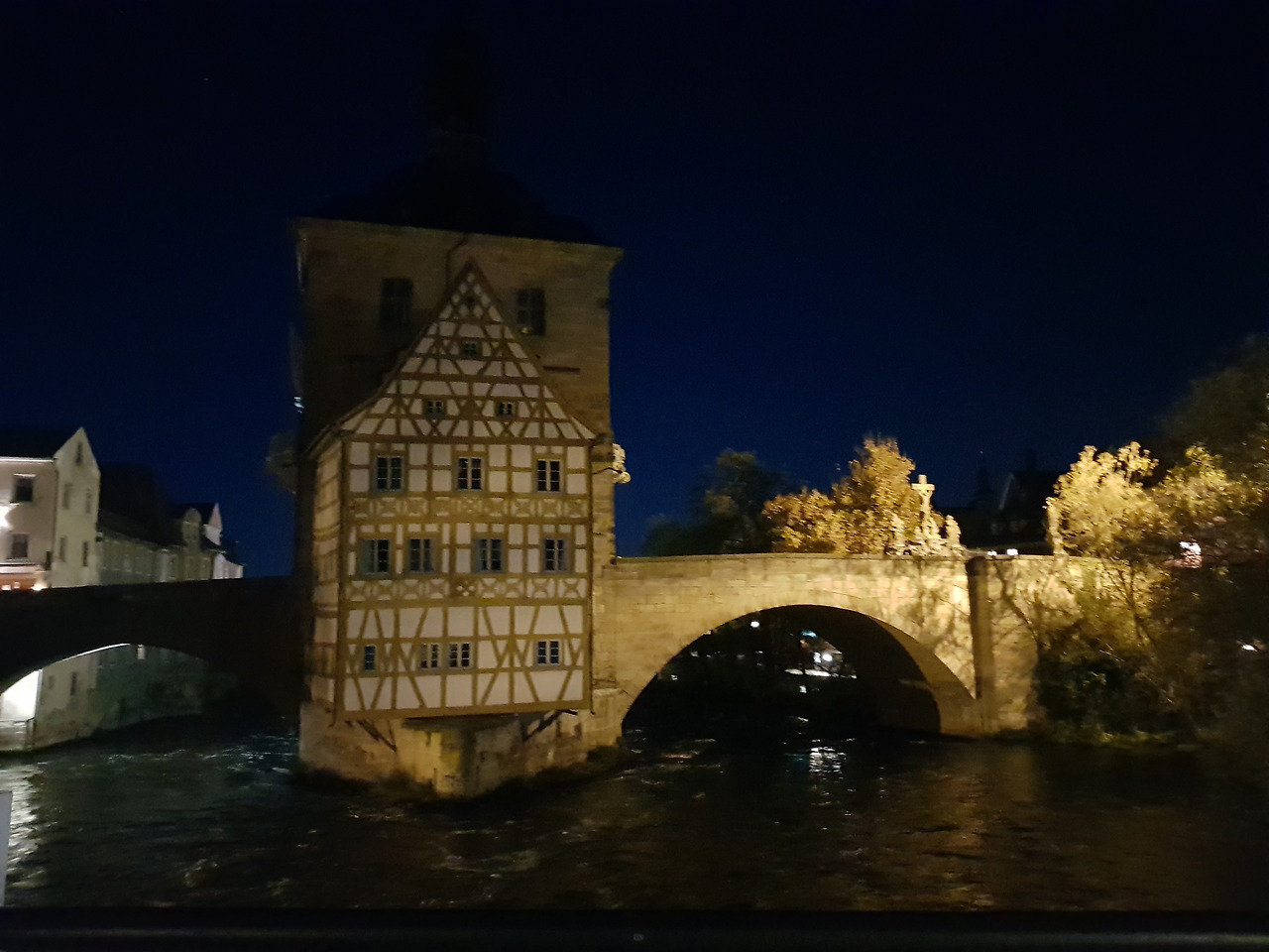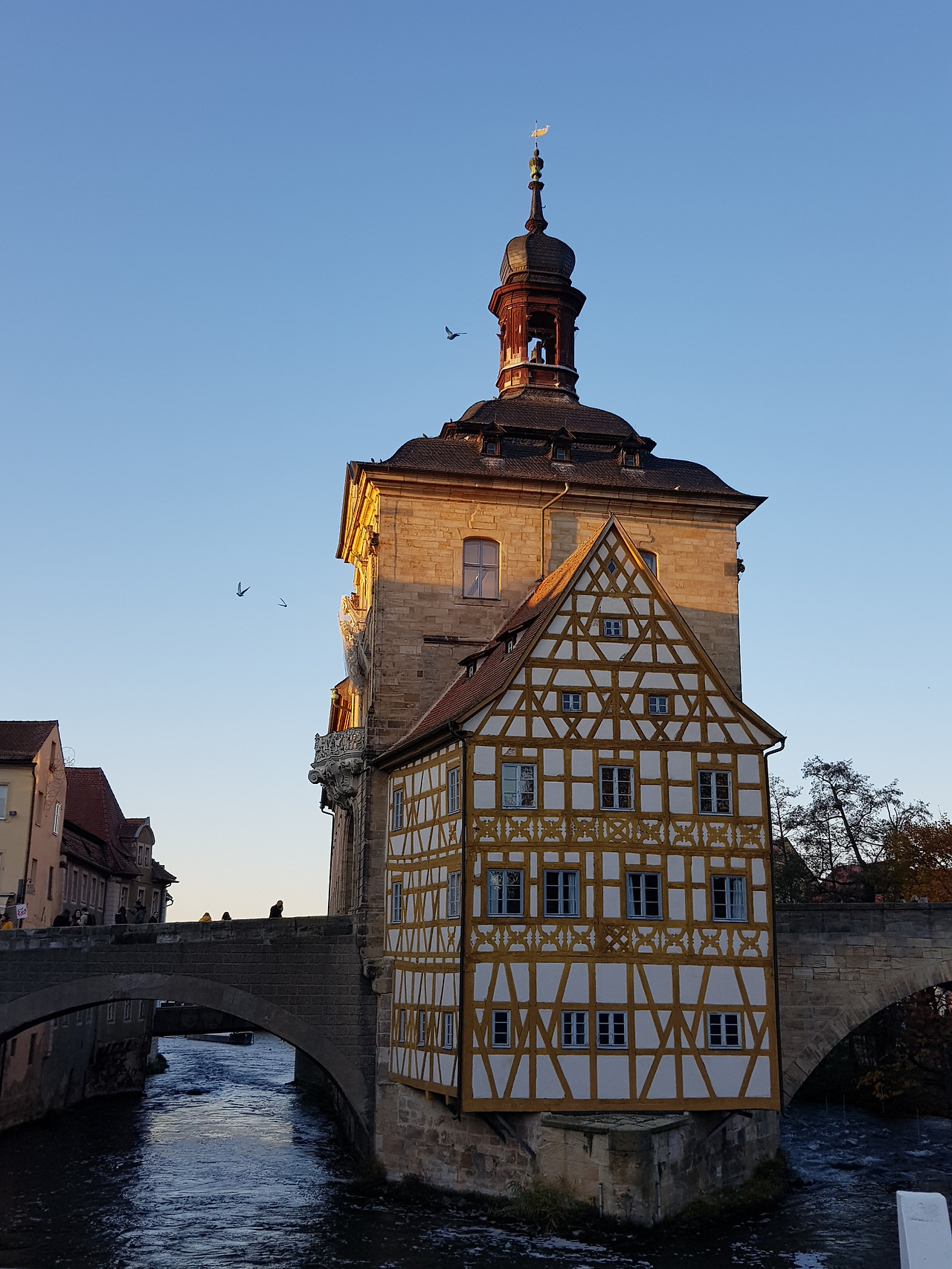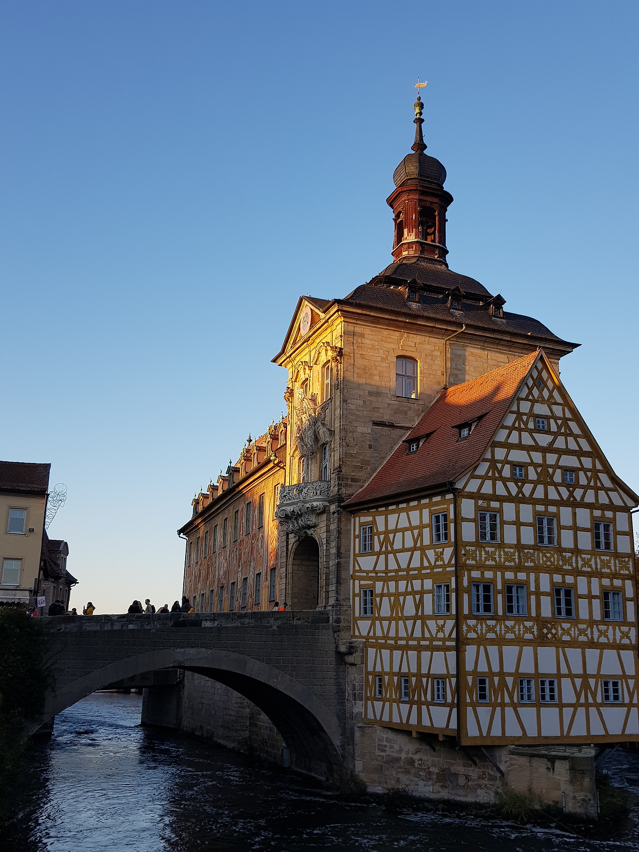 밤베르크는 독일 남부 바이에른의 작은 도시다. 인구는 7만. 2차 세계대전 때 드물게 파괴되지 않아서 특히 아름답다. 도시 전체가 중세의 모습을 간직하고 있기에 1993년 유네스코 세계문화유산으로도 등재되었다. 시청 위치도 특이하다. 도시를 가로지르는 레그니츠 강 가운데에 있다. 대성당과 가톨릭 주교가 살던 궁전쪽과 일반 시민들이 살던 반대쪽이 서로 시청을 짓겠다고 나서자 어쩔 수 없이 강 한가운데에 짓게 되었다. 강과 운하를 따라 아름다운 풍경을 볼 수 있어 '독일의 베니스' 혹은 '작은 베니스'라고도 불린다. (놀란 건 우리 말고도 독일 관광객들이 제법 있더라는 것. 밤베르크는 가게 안이든 밖이든 모든 곳에서 마스크 필수.도시락 지참. 다른 사람들과 거리두기 노력함.)