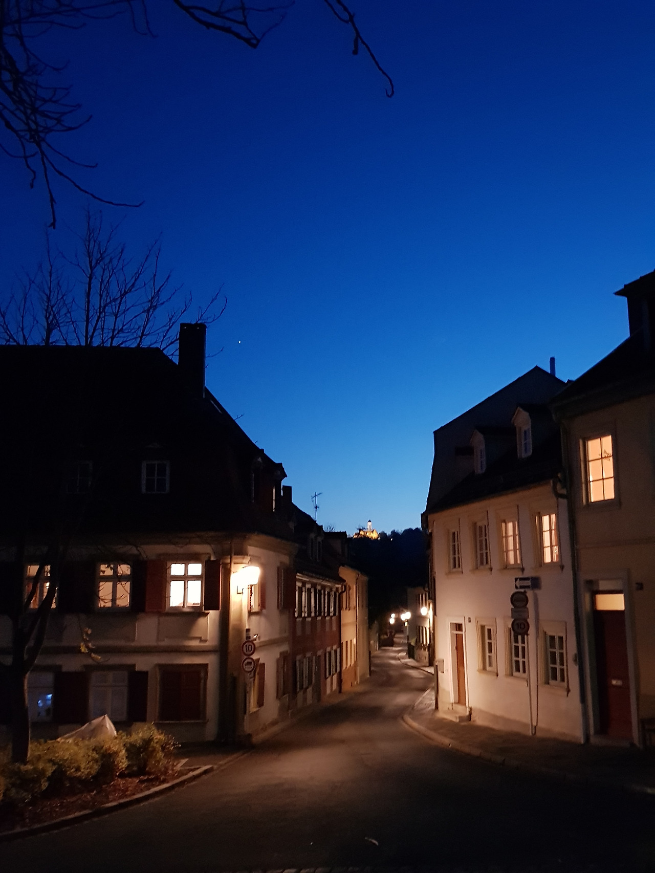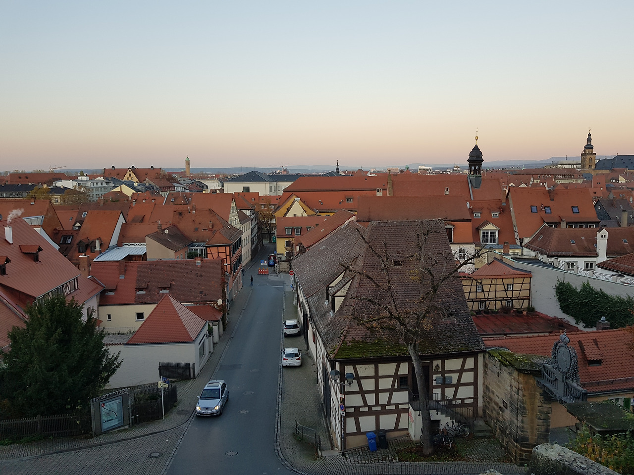 대성당 앞 광장에서 언덕길을 오르면 수도원이었던 성 미하엘 성당이 있다. 현경 아빠가 아니었다면 못 볼 뻔했다. 오후 5시도 되기 전에 날이 어두워져 잠시 헤맬 때 그의 사교성이 빛났다. 친절한 중년 독일 남성의 안내로 수도원을 찾았다. 성당 건물은 보수 중이었다. 어두운 중세 수도원의 담장을 따라 걷는 일은 순례자의 길을 걷는 것과도 비슷했다. 수도원은 넓었다. 마스크를 쓴 독일 사람들과 멀찍이 떨어져 수도원의 낮은 담장 아래 밤베르크 구시가지를 내려다보는 일은 얼마나 평화롭고 평온하던지. 밤베르크의 거리와 골목길도 좋았다. 귀족적이라 할까. 건물들의 우아한 외관과 차분한 건물 빛깔에는 품격이 배어있었다. 저물어가는 늦가을이 중세 도시에 고즈넉함을 더해주었다.