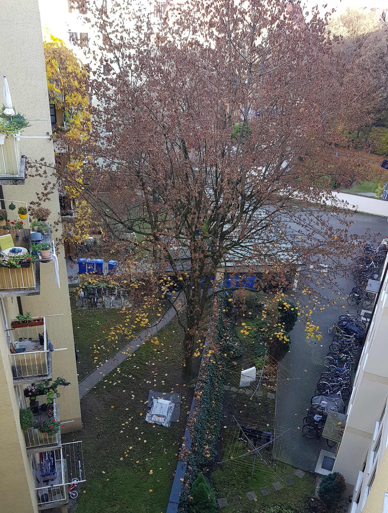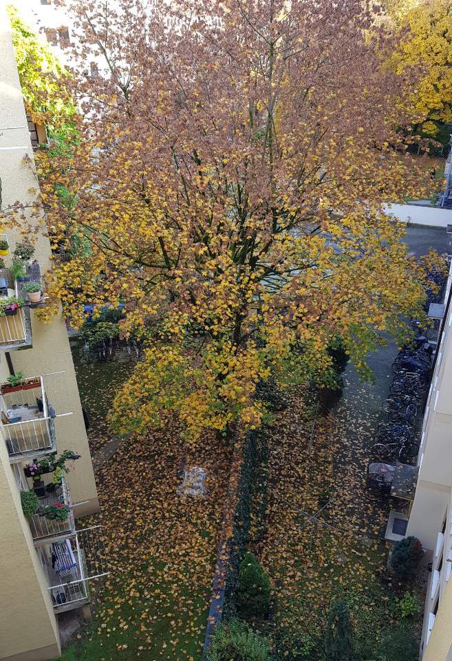 범들이 발자국도 안 남기고 사뿐히 넘어왔을 것 같은 빨간 지붕(위), 베란다 너머 이웃 정원의 10월과 11월.
