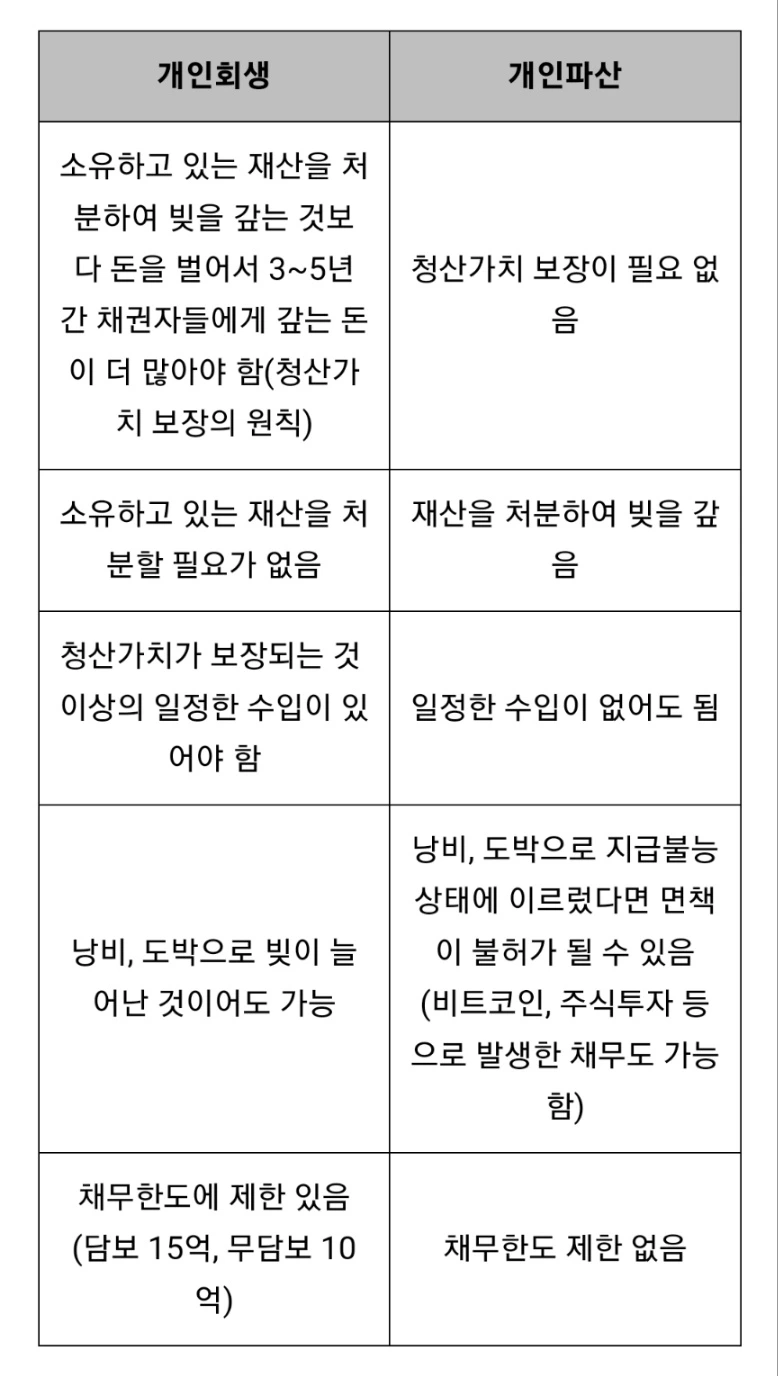 오늘은 많은 분들께서 궁금해하시고, 문의를 주시는 개인회생과 개인파산의 차이점에 대해서 알아보도록 하겠습니다. 간단하게 표로 정리하였으니 표를 참고하여 주시기 바랍니다.