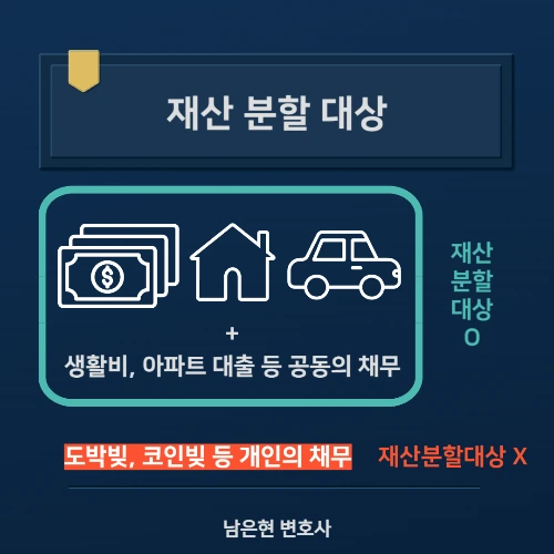 원칙적으로 코인빚 이혼, 도박빚 이혼할 경우, 부부의 재산은 물론 부채도 재산분할의 대상이 됩니다. 부부의 적극재산, 즉 현금, 자동차, 부동산 등과 함께 소극재산인 빚도 분할 대상에 포함됩니다. 그러나 여기서 중요한 것은 부채의 성격입니다. 부부가 공동생활을 위해 발생시킨 빚, 예를 들어 생활비, 자녀 교육비, 아파트 구입을 위한 대출자금 등은부부 공동의 채무로 간주되며, 이혼 시 재산분할의 대상이 됩니다. 이러한 경우, 부부는 해당 채무를 함께 부담해야 할 의무가 있습니다.