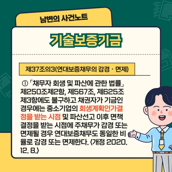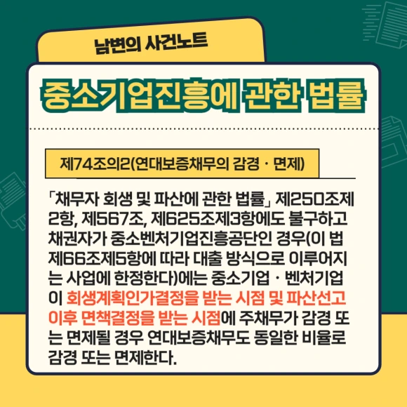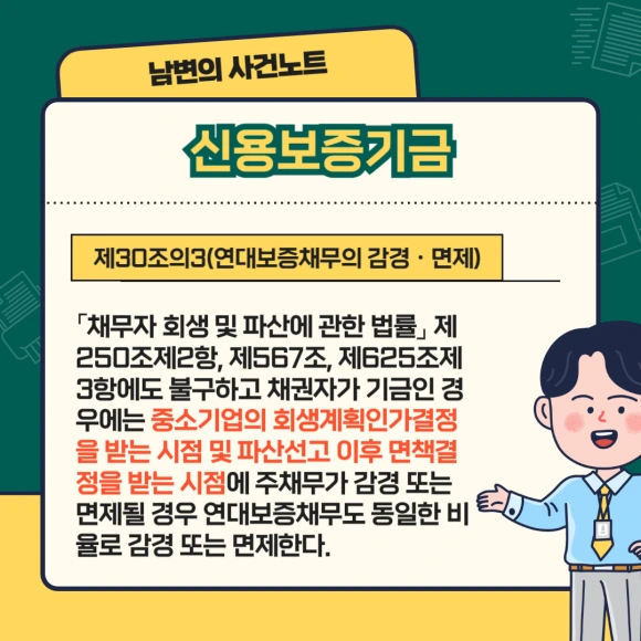이에 대한 문제를 해결하기 위해 2013년 신용보증기금법, 기술신용보증기금법, 중소기업진흥공단법 등 개별법을 신설하여 위의 세 기관의 경우에는 주채무가 경감되면 보증채무도 경감되도록 규정을 하였습니다.