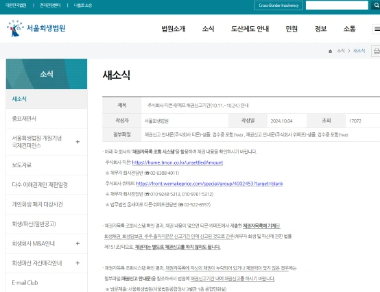 채권자 목록 확인: 티메프 측에서 제출한 회생 채권자 및 담보권자 목록은 2024년 10월 10일에 공개되었습니다. 수만 명의 채권자가 있는 만큼, 누락되거나 잘못된 부분이 있을 수 있으니 꼭 확인해보셔야 합니다.