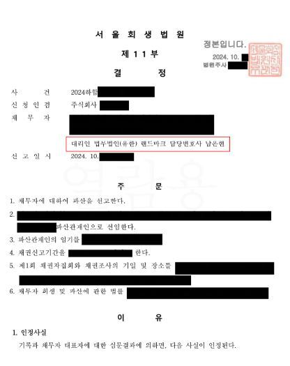 파산신청서 접수 후 일주일 만에 대표자 심문기일이 지정되었으며, 이후 파산선고와 파산관재인 선임 절차가 신속하게 진행되었습니다.
